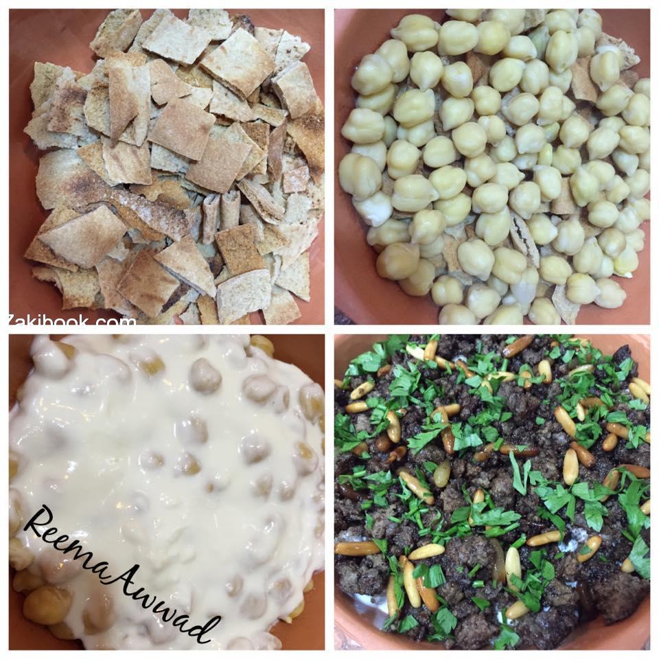فتة الحمص الحب باللبن واللحمة المفرومة