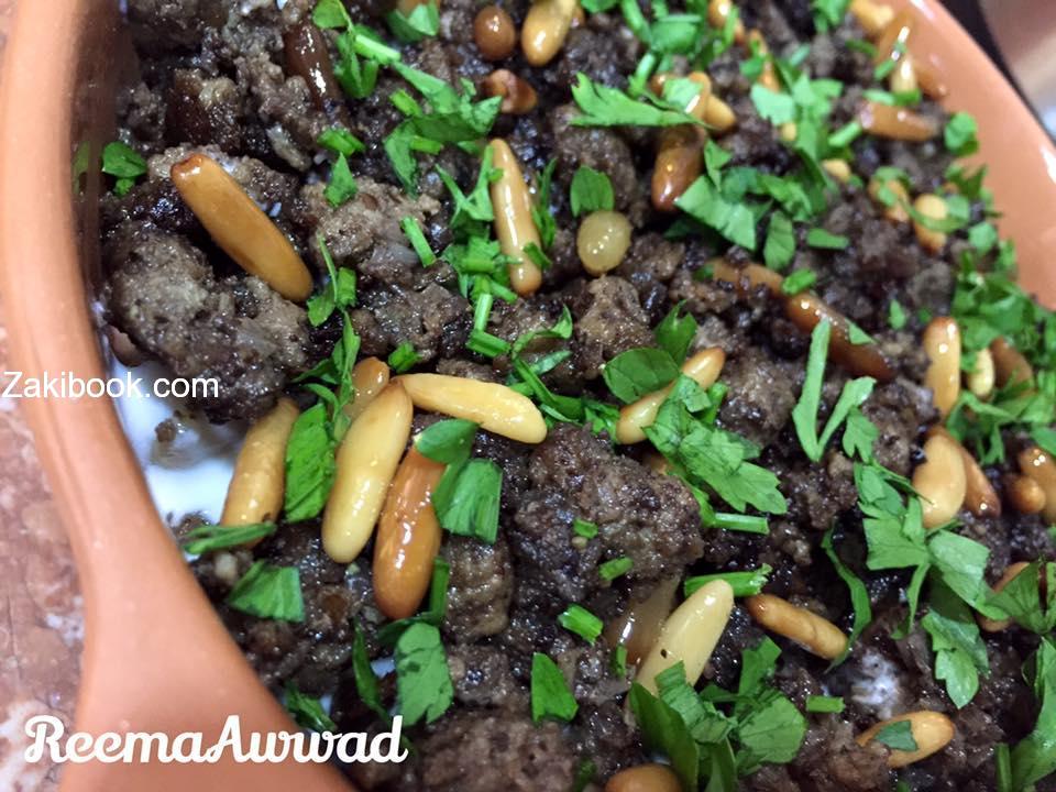 ٤- بتقلبي لحمة مفرومة بشوية زيت مع رشة فلفل أسود وبهار حلو ورشة قرفة وملح وسماق (اختياري) وبتوزعيهم فوق اللبن