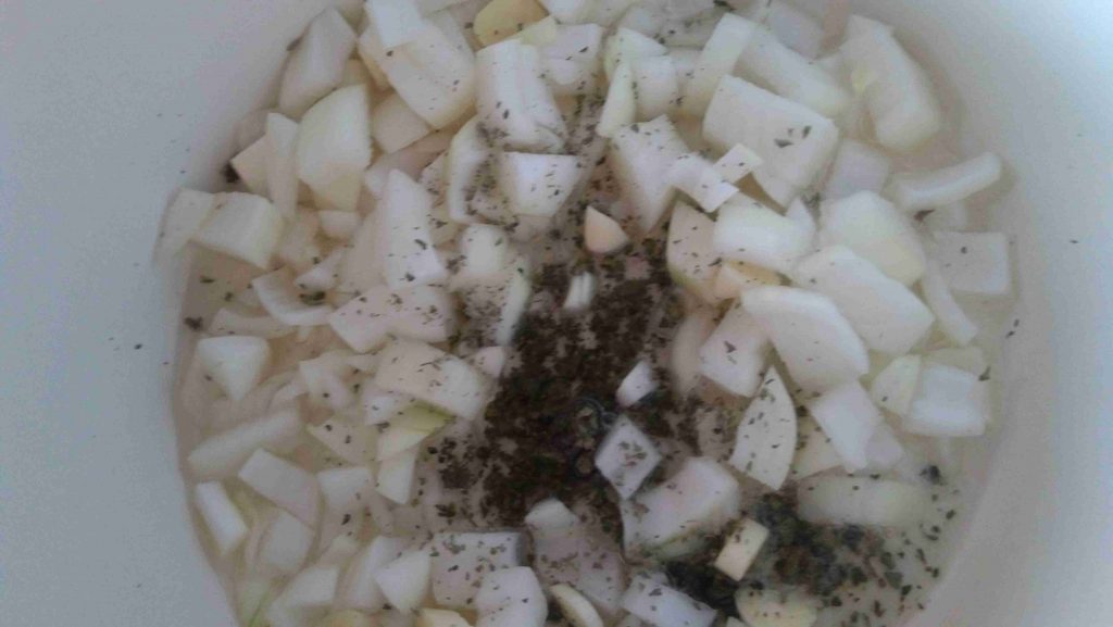 ثم نضع الزيت ونضع البصل والثوم مع الزعتر الاخضر الناشف ….الزعتر الاخضر بهالطريقه بيعطي طعم جدا رائع وبيعزز النكهه وخصوصي زيتو لمن يتطاير بسبب تحميصو مع الزيت