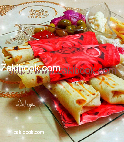 – بعدها نحشي الخبز بالدجاج وانا ضفت مخلل خيار وبصل مع سماق وصوص الشاورما عبارة عن: علبة لبن زبادي، ربع كوب طحينية، عصير ليمونة، توم مهروس، رشة ملح خلطتهم كويس وتركتهم بالثلاجة ساعة وبعدها استخدمته، وبس لفيتهم رجعت كبستهم على الشواية وصحة وهنا.