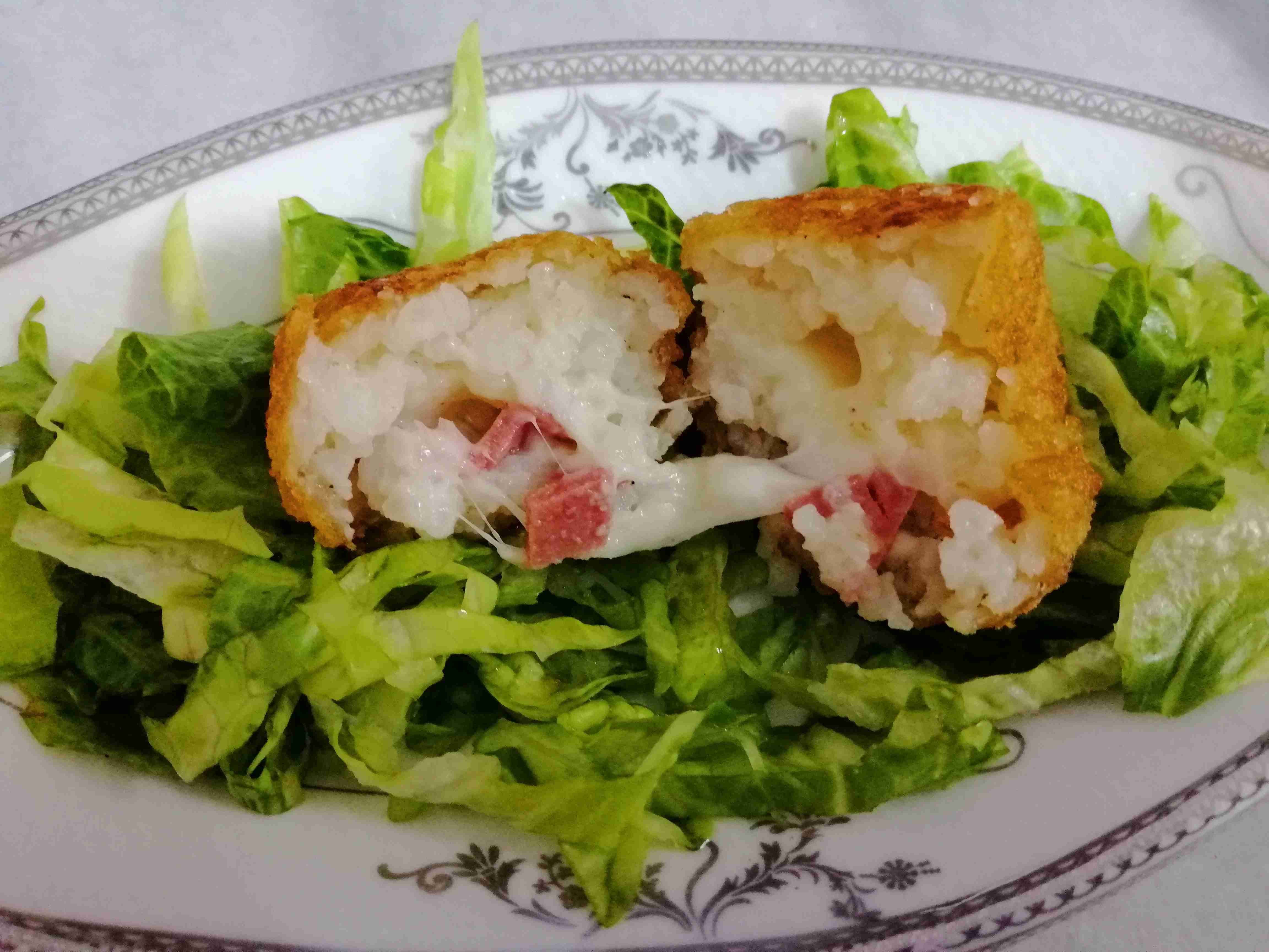 بعد هيك بعملهم أقراص وبنكون مجهزين الحشوه… الحشوه جبنه موزاريلا مبروشه وبنضيفلها سلامي مفروم.. منحط الحشوه بنص القرص وبنعمله كره والحجم متل مابتحبي