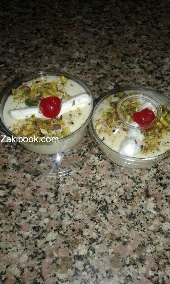 ٤ كاسات حليب ممكن يكون الحليب سائل او او باودر اذا كان باودر كل كاسه ٣ ملاعق حليب نيدو نضع بالطنجره الحليب سكر حسب الطلب ً٢ ملعقة نشا نص ملعقه صغيره ماء زهر زبده قطعه كبيره مع علبة قشطه كامله, والزينه لوز مقشر جوز هند, والكرز المعلب.