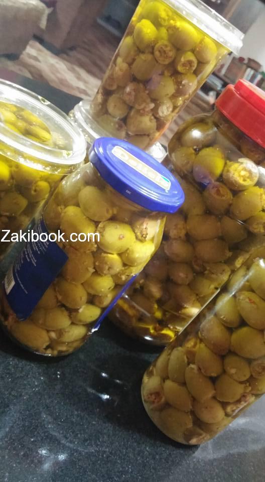 * نصفي الزيتون و،نقوم بحشوه بالحشوة المحضرة ، ونضعه بمرطبان ، ثم نغمره بزيت زيتون ، أو أي زيت نباتي متوفر عندكم ، رغم أنه يفضل طبعا بزيت الزيتون لأنه أطيب وألذ .
