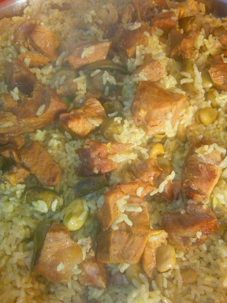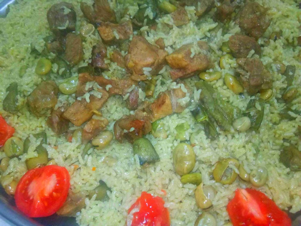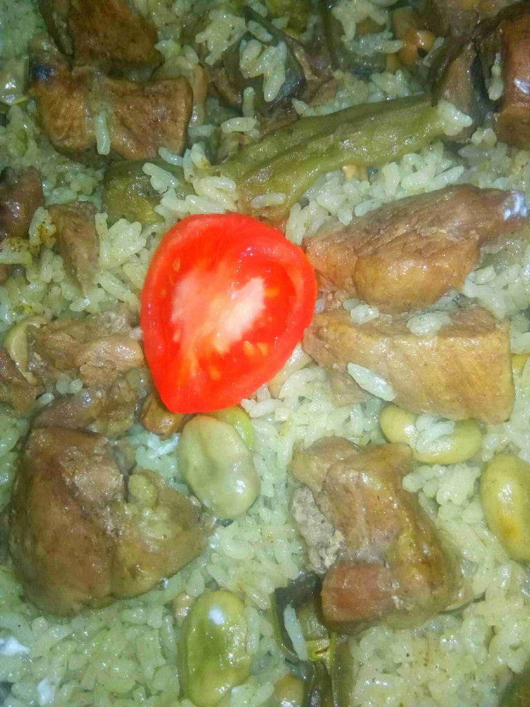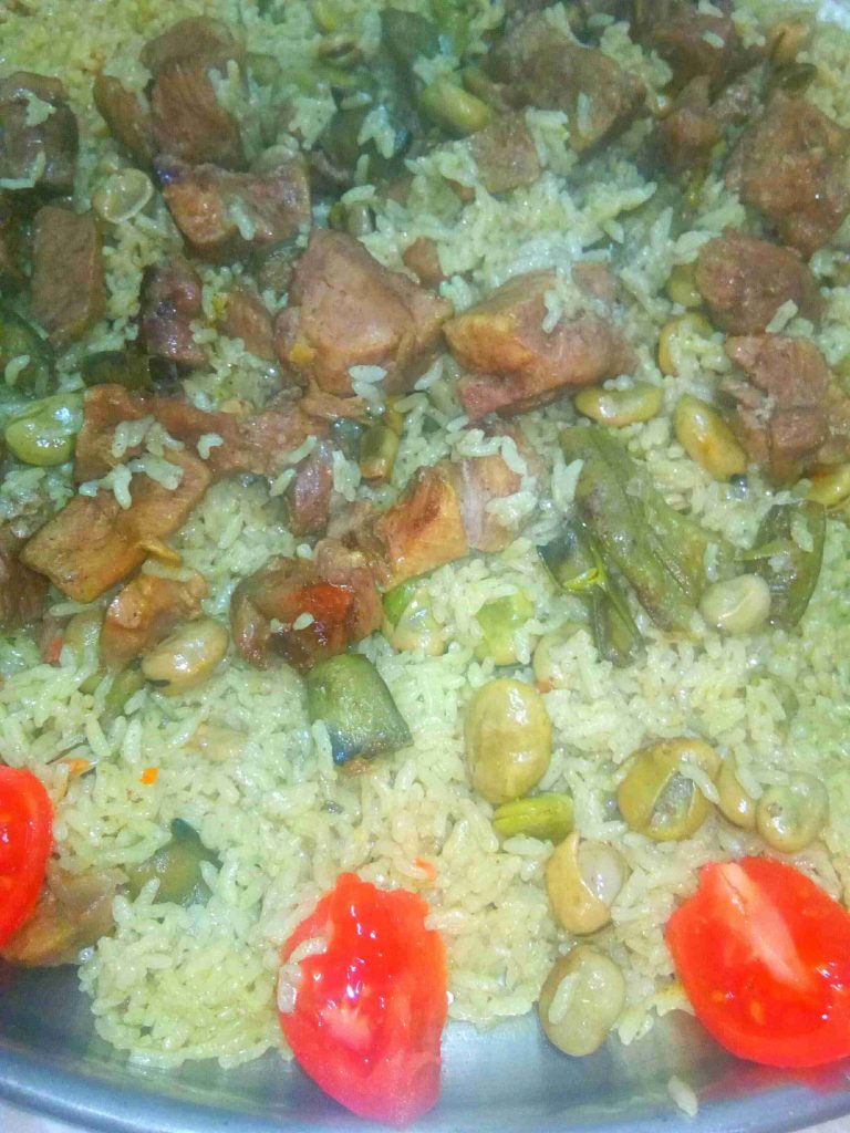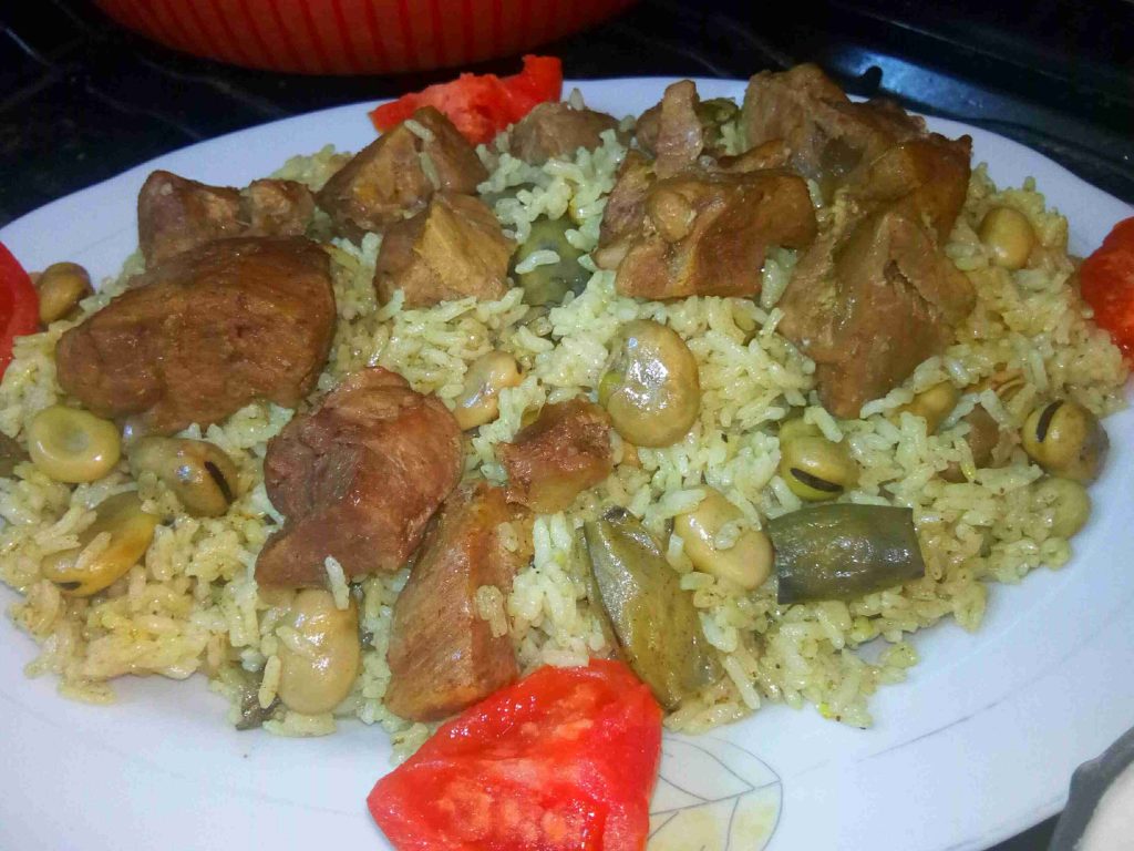 بنسلق اللحمة مع المطيبات الغار والقرفة وبعدين بنضيف الملح والبهارات وبنخليها على جنب وبنصفي المرقة بنصفي الرز المنقوع وبنقلي الفول المقطع نص قلية وبنخلطه بالرز