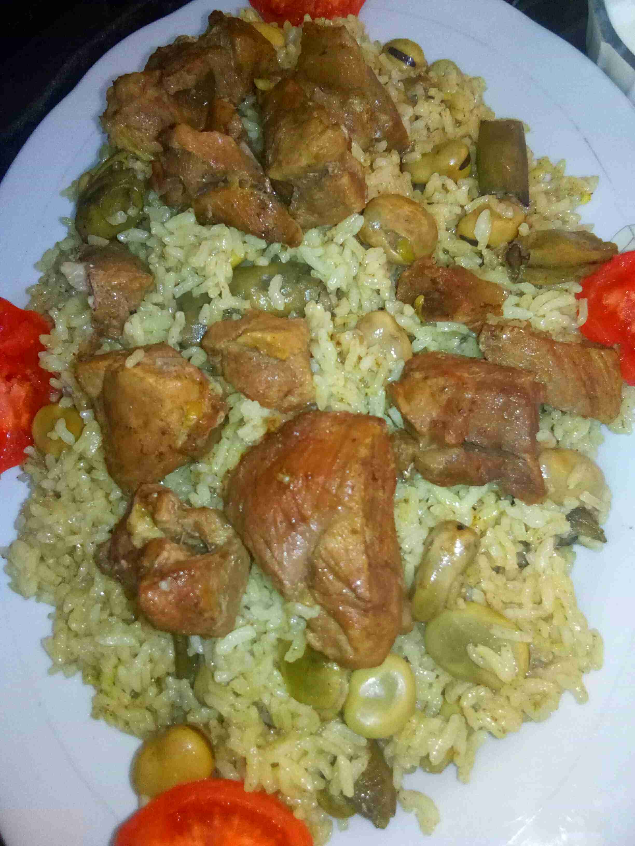 بنسلق اللحمة مع المطيبات الغار والقرفة وبعدين بنضيف الملح والبهارات وبنخليها على جنب وبنصفي المرقة بنصفي الرز المنقوع وبنقلي الفول المقطع نص قلية وبنخلطه بالرز