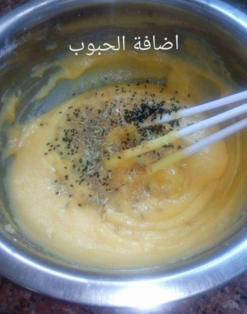 بنخلط بالبداية السكر والزيت والبيض والفانيلا والخل وبنضيف المواد الجافة الطحين والبيكنج باودر وبنخلط بدون زيادة سوائل وبنضيف م.ص سمسم وم.ص حبة البركة وم.ص شومر او يانسون بيثقل الخليط شوي هوه قوامه اثقل من خليط الكيك بس إذا كان جامد معك ضيفي بالملعقة حليب سائل لحتى يصير قوام معقول.