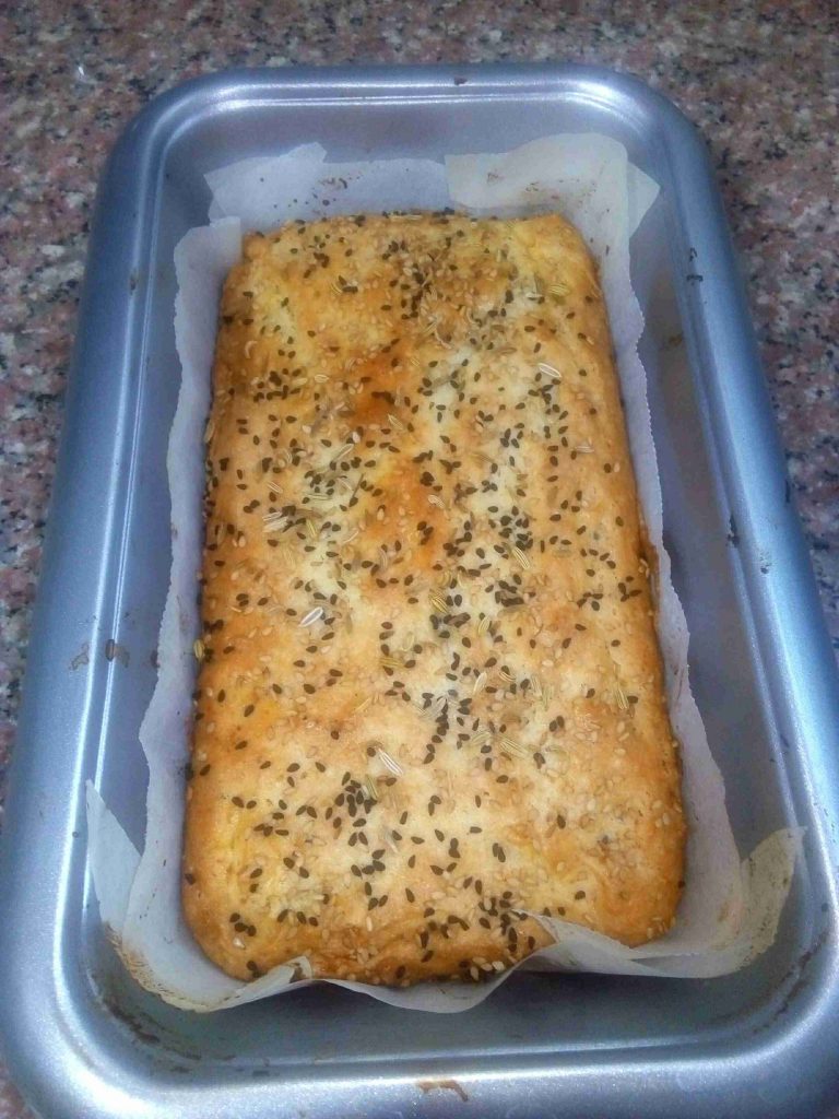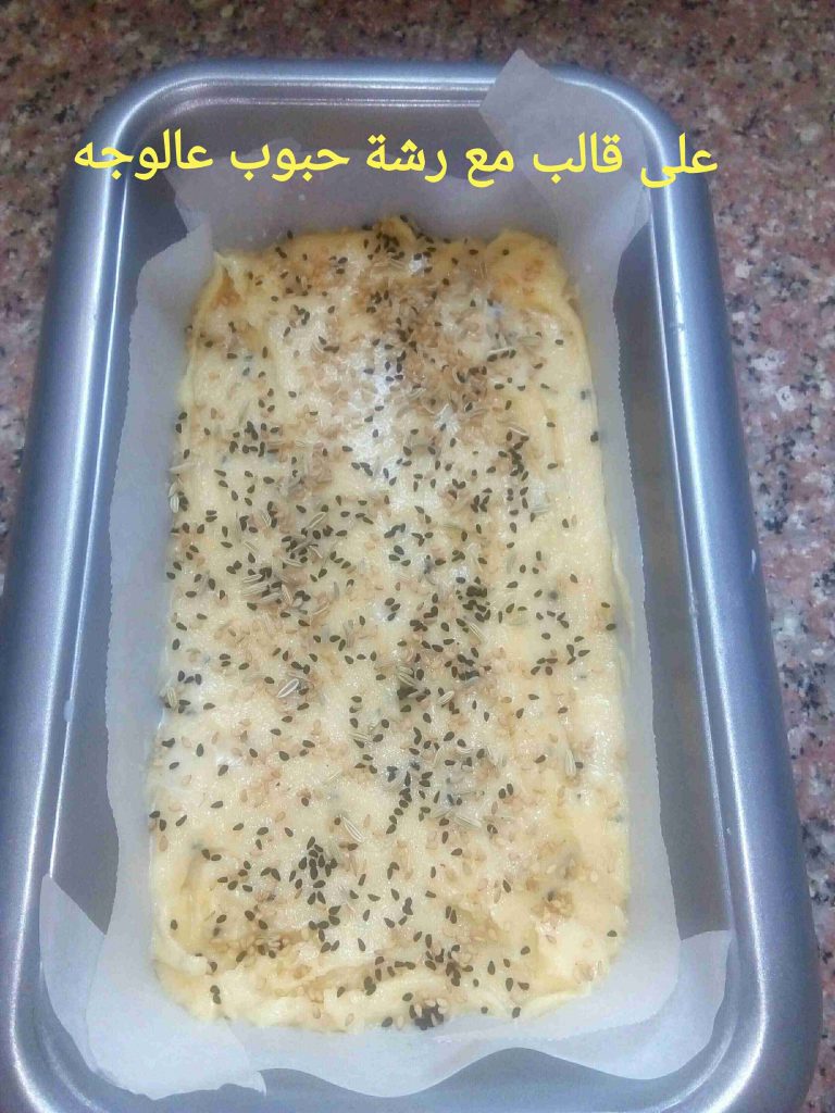 بنفرغ الخليط في قالب توست او صينية مستطيلة مربعه مدهونة زيت ورشة طحين او ورق زبدة. وبنرش رشة حبوب عالوجه كمان.