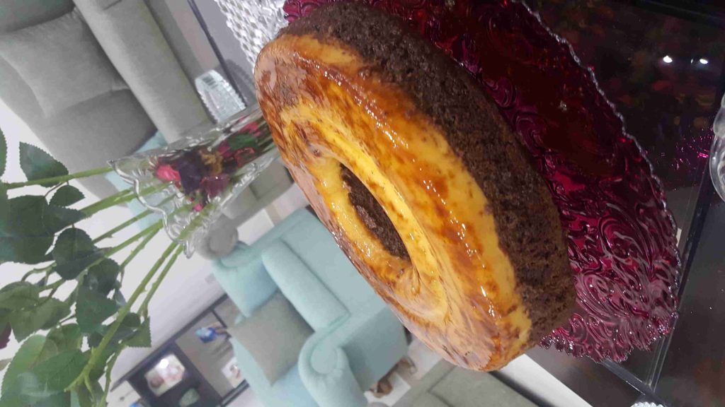 بعدين بتحضري الكيك متل ماهوه مكتوب على الباكيت تبعو وبتديريه فوق الكريم كراميل بالقالب وبتجهزي صينيه فيها مي مغليه وبحط القالب فيها وبحطها بالفرن المحمى ساعه الاربع وبختبرها بالسكينه متل اي كيكه وبس تجهز ممنوع تقلبيها الا بعد ماتبرد تماما بالتلاجه اقل شي ٤ ساعات
