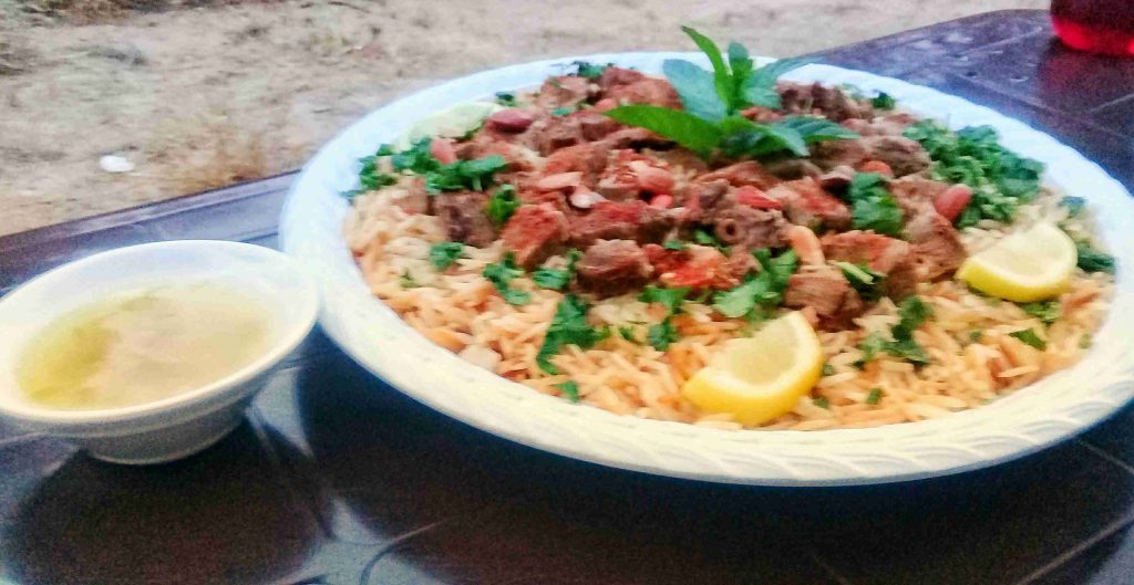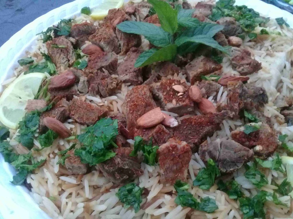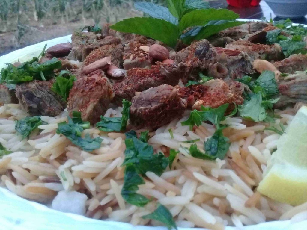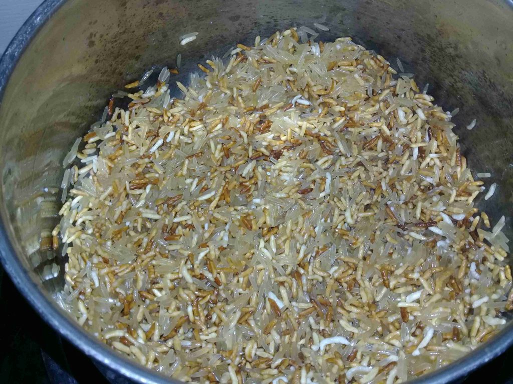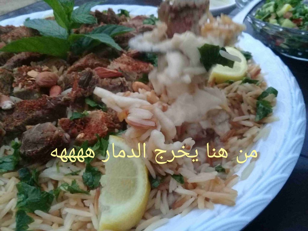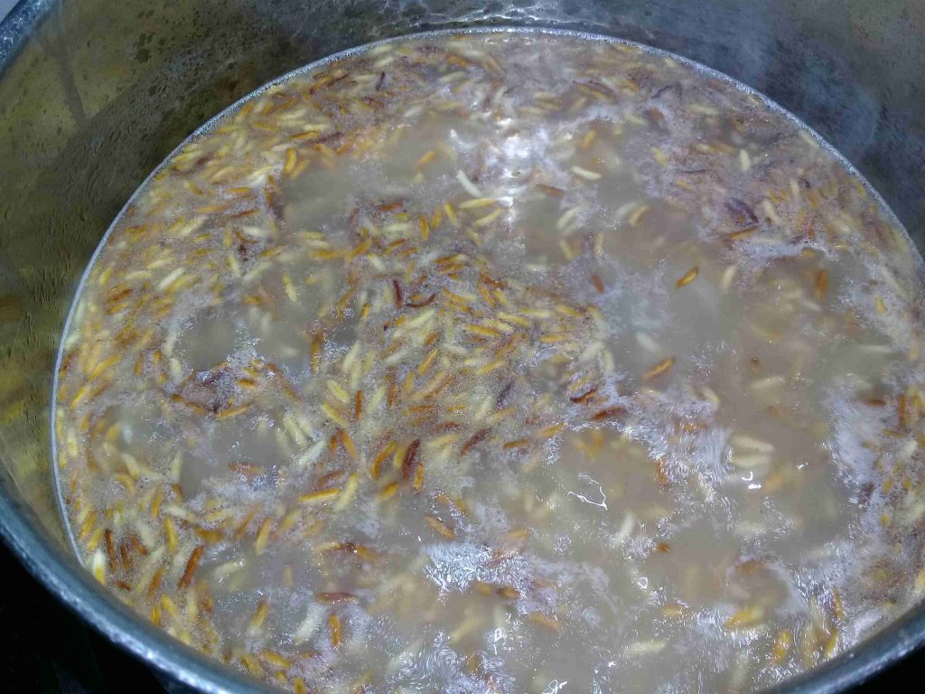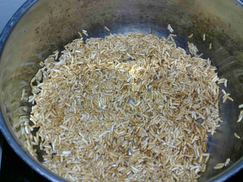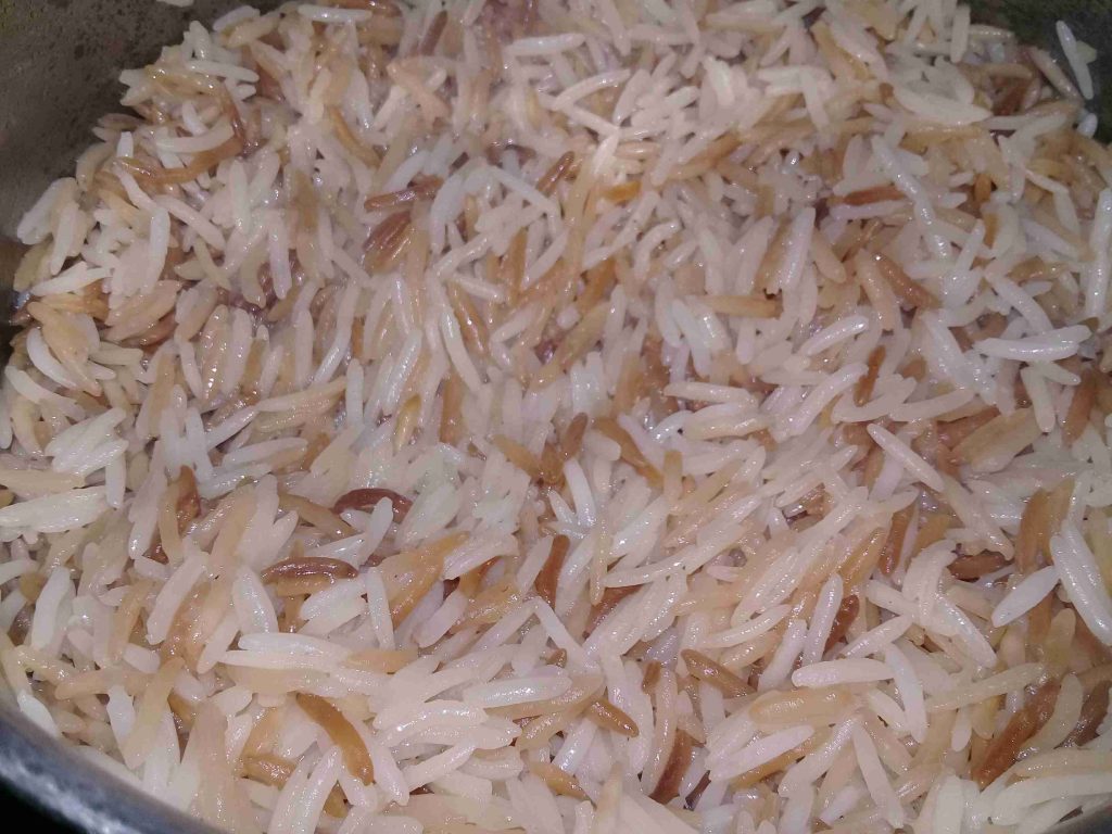 بسلق اللحمه مع المطيبات لما تستوي بأخد مرقتها وبعمل فيها الرز بسخن طنجره وبحط فيها معلقه سمنه بحمص نص كميه الرز لما يصير لونه ذهبي غامق بضيف باقي الرز عليه وبحركهم مع بعض كويس بضيف المرقه وبتركه ليتفلفل