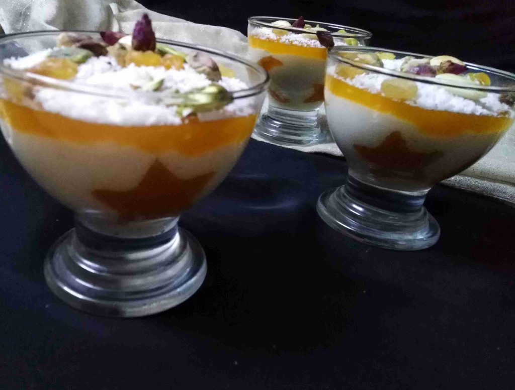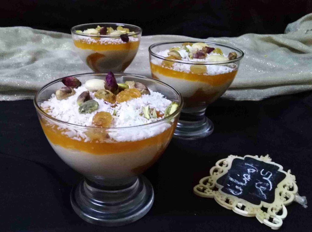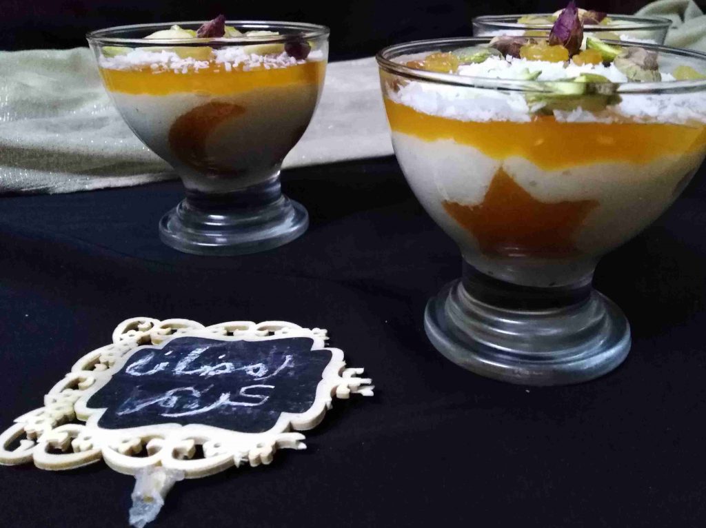 بالخلاط يوضع عصير قمر الدين مع السكر و النشا ثم على الغاز مع التحريك المستمر لتغلي و تتكاثف