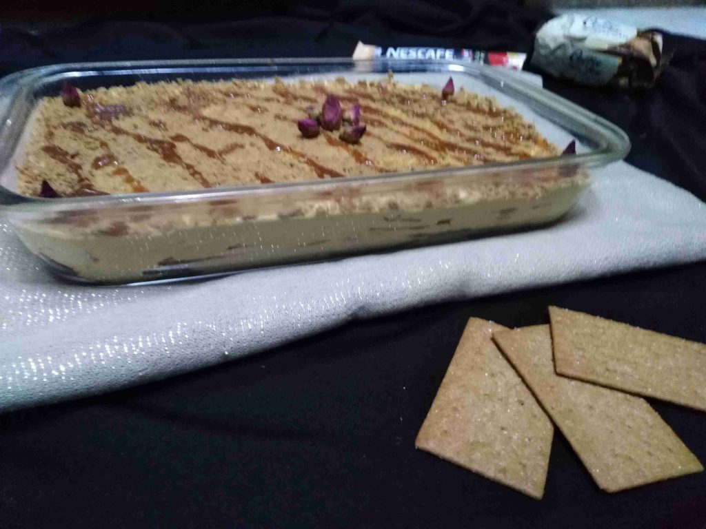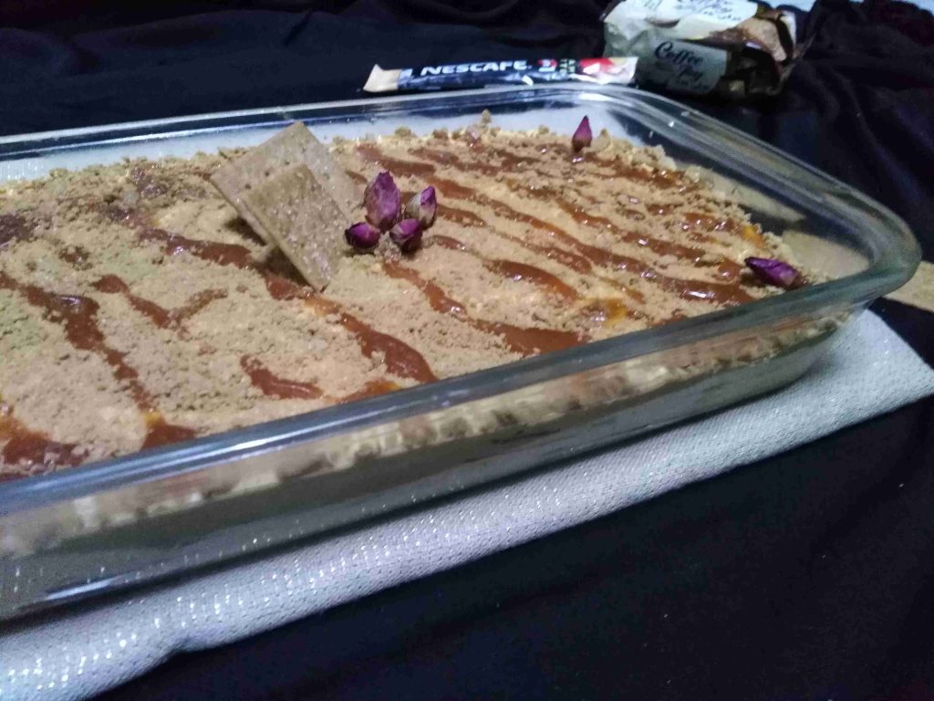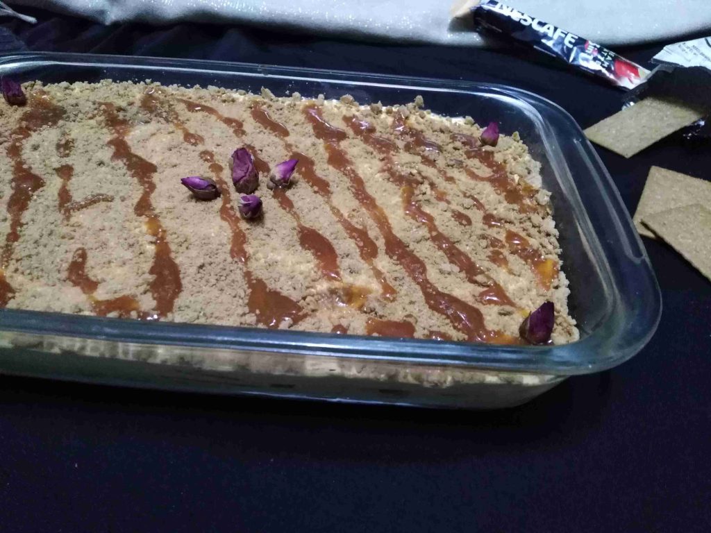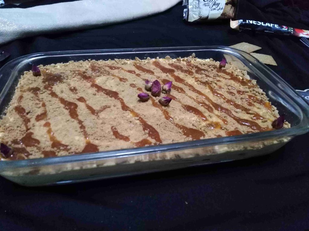 توضع بالتلاجة لمدة ليلة كاملة قبل التقديم تزين ببسكوت مطحون و كراميل