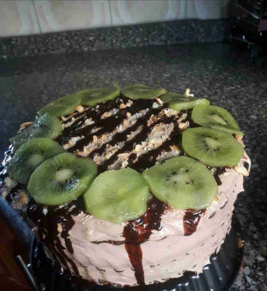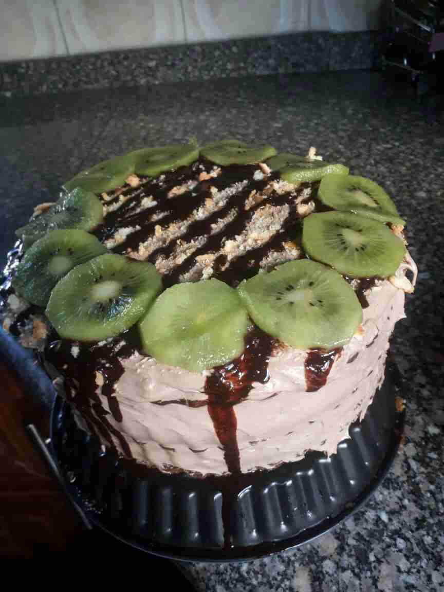 الكريمة :نخفق الكريمة مع الحليب حتى تصبح كريمة متماسكة ونضع بين كل طبقة وطبقة كريمة وعند الانتهاء نضع الكريمة على وجه الكيكة والجوانب ونرتبه ثم نزينه حسب الرغبة