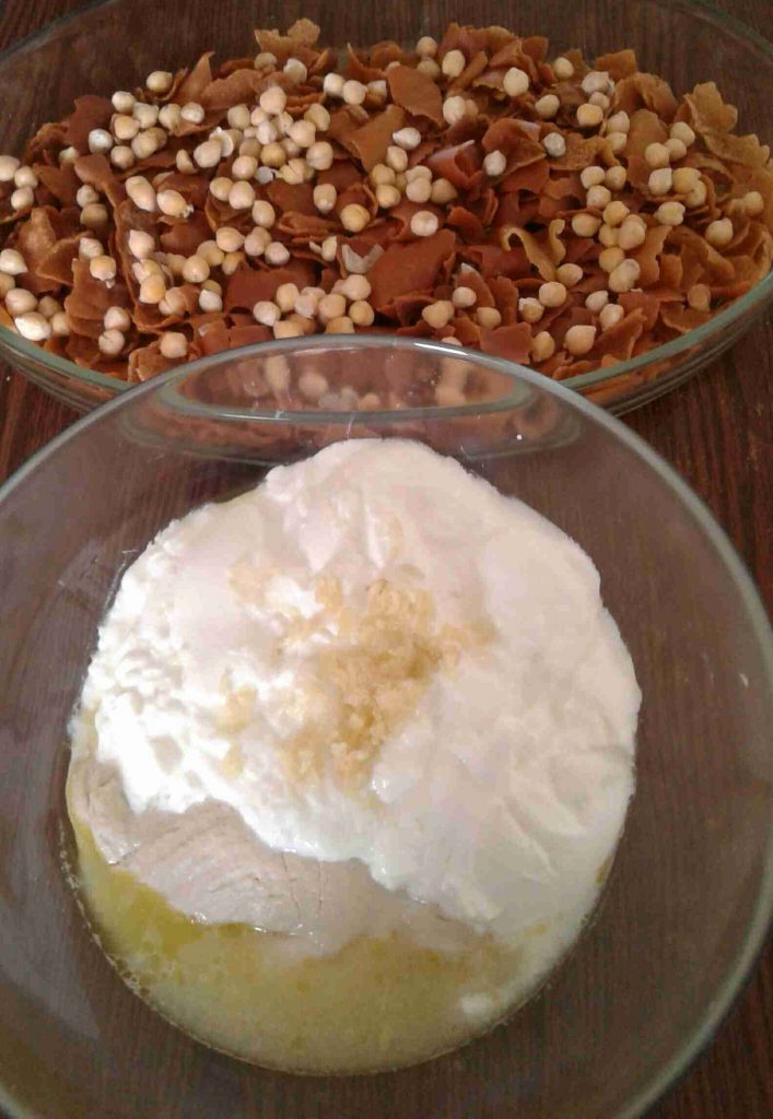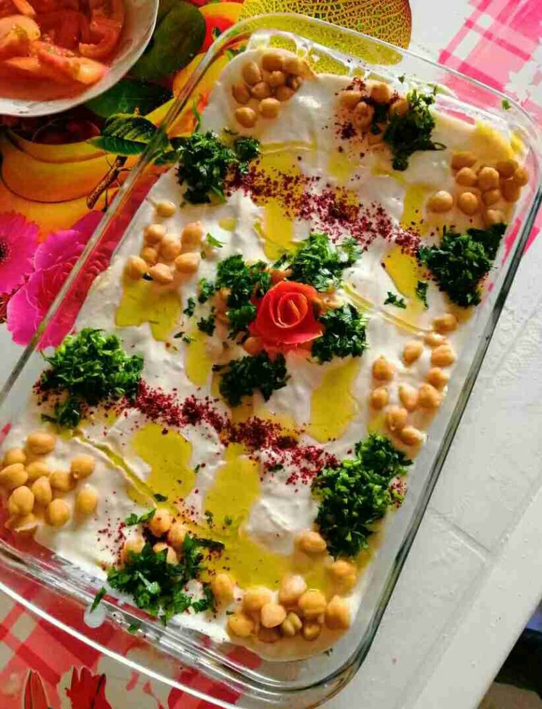 – في طبق عميق : نضع كوبين لبن زبادي ونصف كوب طحينة ونصف كوب عصير ليمون وكوب حمص مهروس وملعقة صغيرة ثوم مهروس وملح حسب الرغبة ، ونخلطها جيدا ، ونضعها طبقة ثانية فوق الخبز .