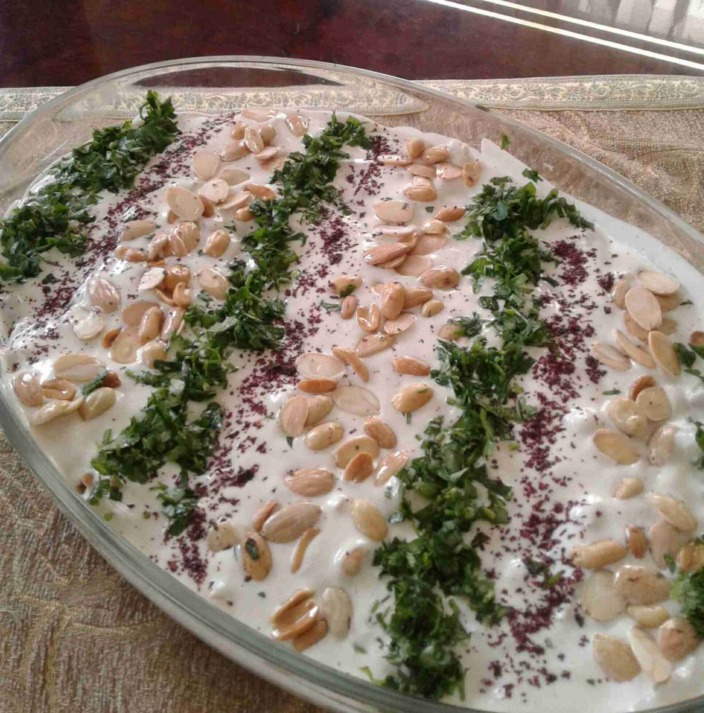 – نزين الطبق بالبقدونس المفروم والمكسرات ورشة السماق .