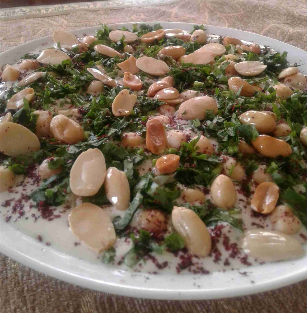 – في طبق التقديم : نوزع الخبز المقلي وحبات الحمص ونرشها بالقليل من ماء سلق الحمص.
