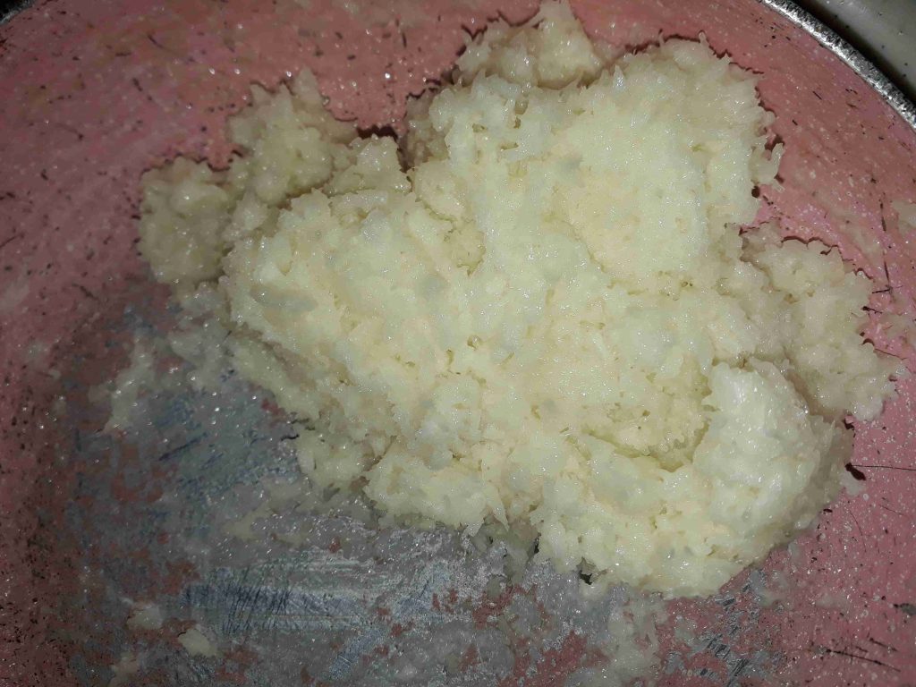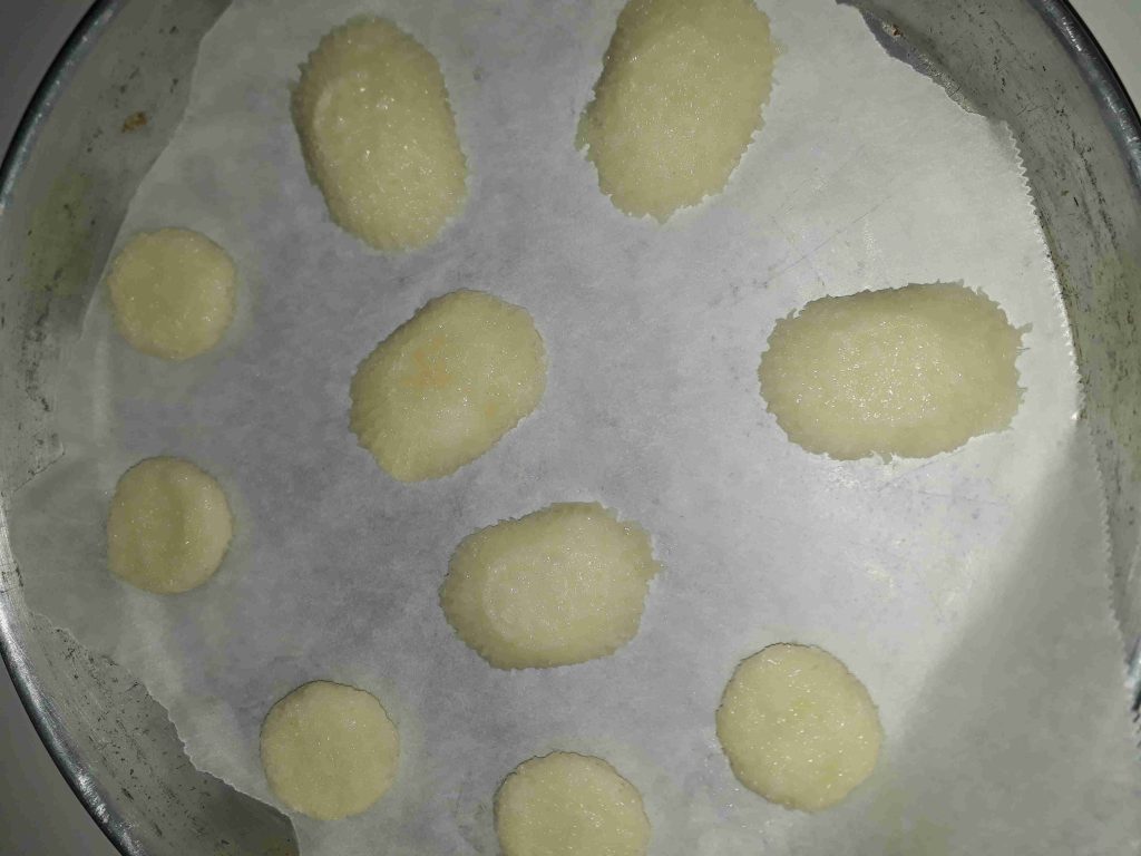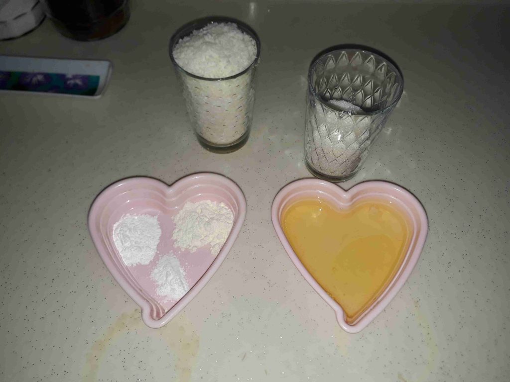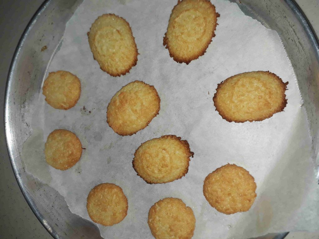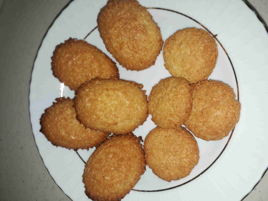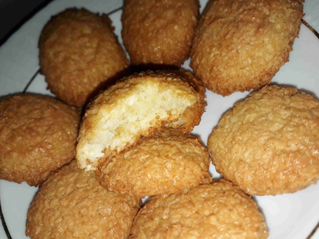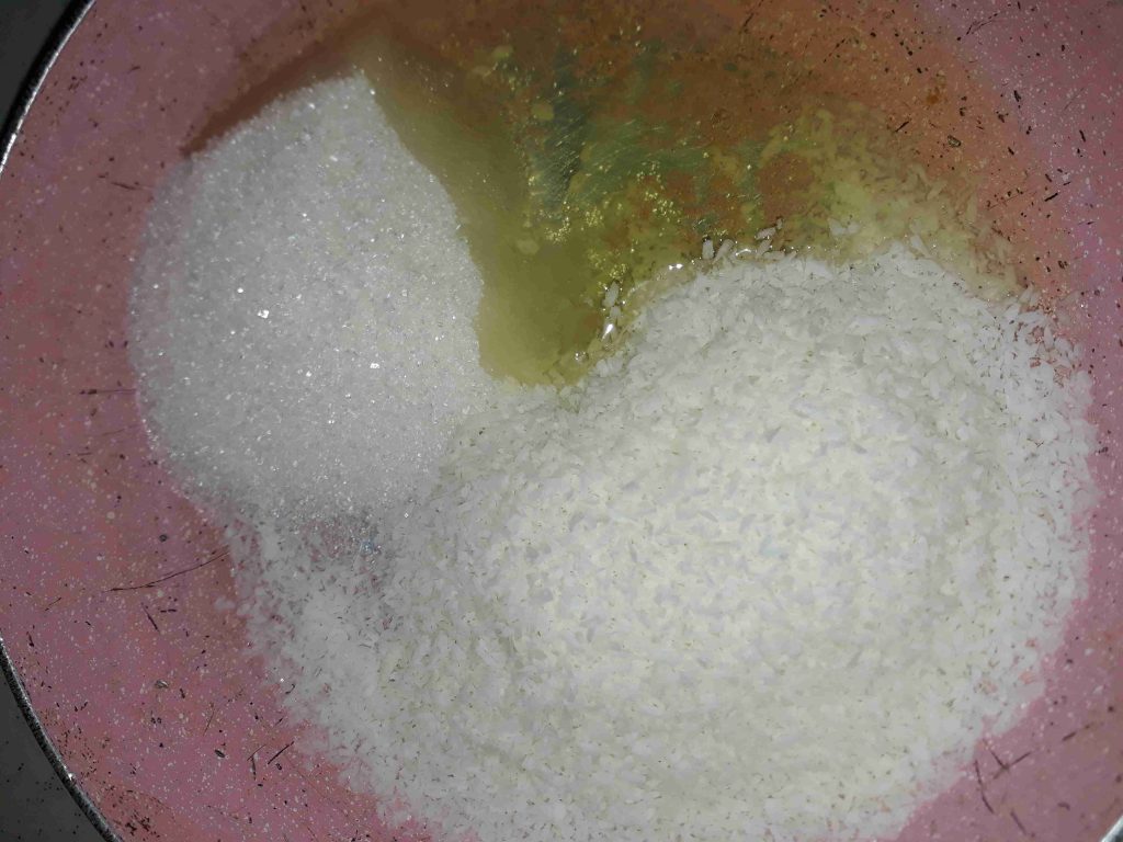 بمقلاة عالغاز حطيت السكر وبياض البيض وجوز الهند وصرت اخلطن ع غاز واطي كتير مدة سبع دقايق بدنا نطبخ البيض وبنفس الوقت يدوب السكر هلق بالاول رح يتجمع كتلة وحدة بس عالتحريك رح يدوب السكر بس عدت السبع دقايق بشيلا من عالغاز وبضيف عليها فانيلا والبيكنج باودر والطحين وبخلطن منيح هلق صار دور التشكيل بدك تعملين دوائر بدهن ايدي زيت وبكورن بضغط عليهن ضغط خفيف او بدك هنن شكل بيضوي حسب شوبدكن انا عملت طريقتين