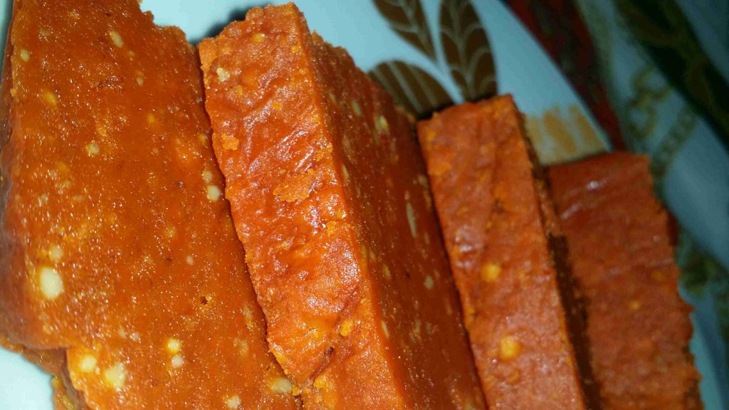 نمسح صينية بزيت ونسكب فيها الحلاوة وفينا نزين الوجة بسمسم أو فول سوداني ونتركها تبرد تماماً ونقطعها مربعات أو حسب الرغبة