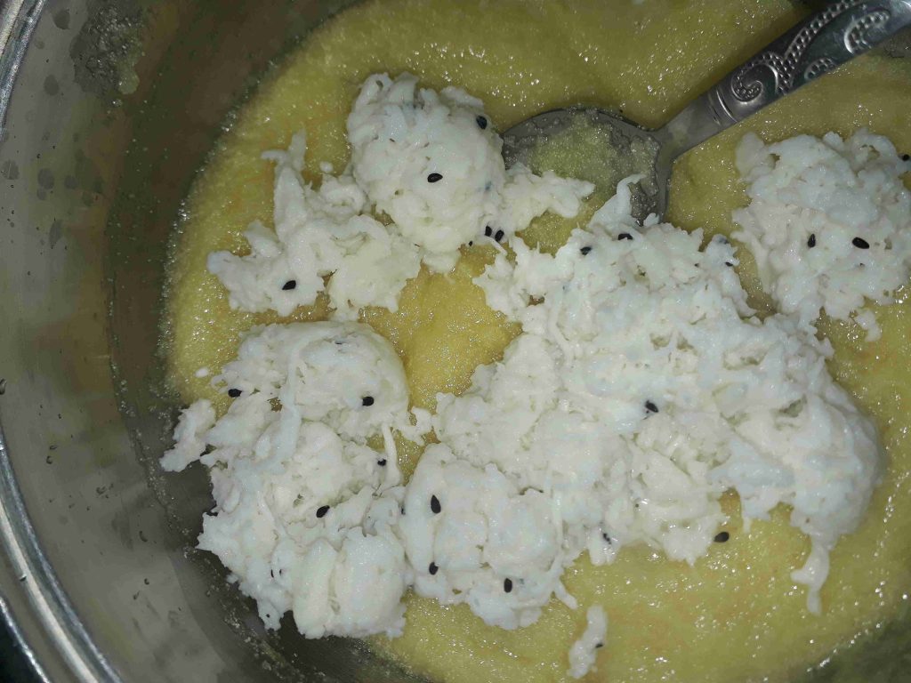 (حطيت السكر والمي عالغاز بس بلشو يغلو حطيت فوقن ماء الزهر و السميد تركتن دقيقتين نزلت فوقن الجبنة وصرت اخلط بسرعة لتدوب الجبنة تركتن خمس دقايق وانا احرك بعد ماخلصت طفيت تحتن وتركتن خمس دقايق ليبردو شوي بعد مابردت دعكتا شوي
