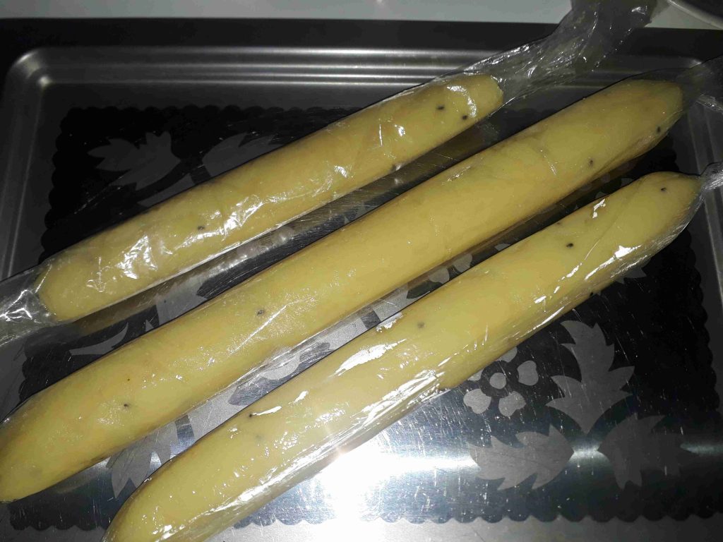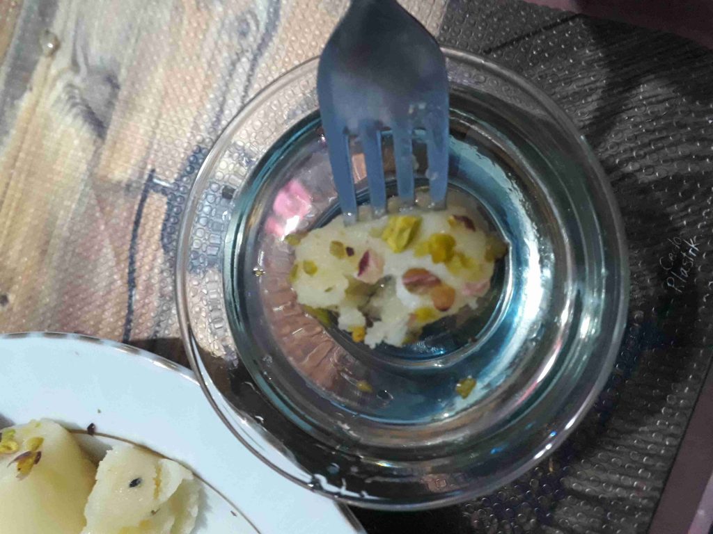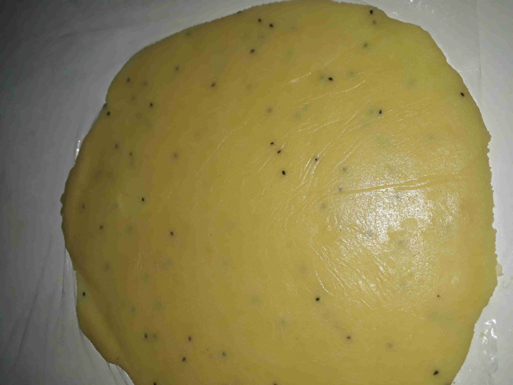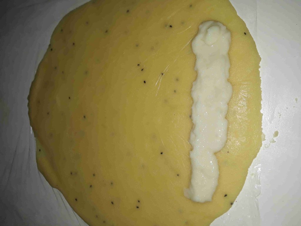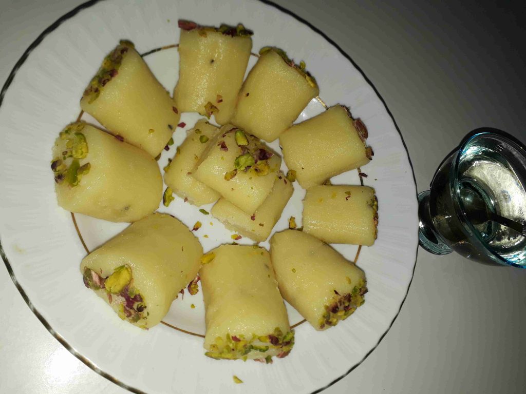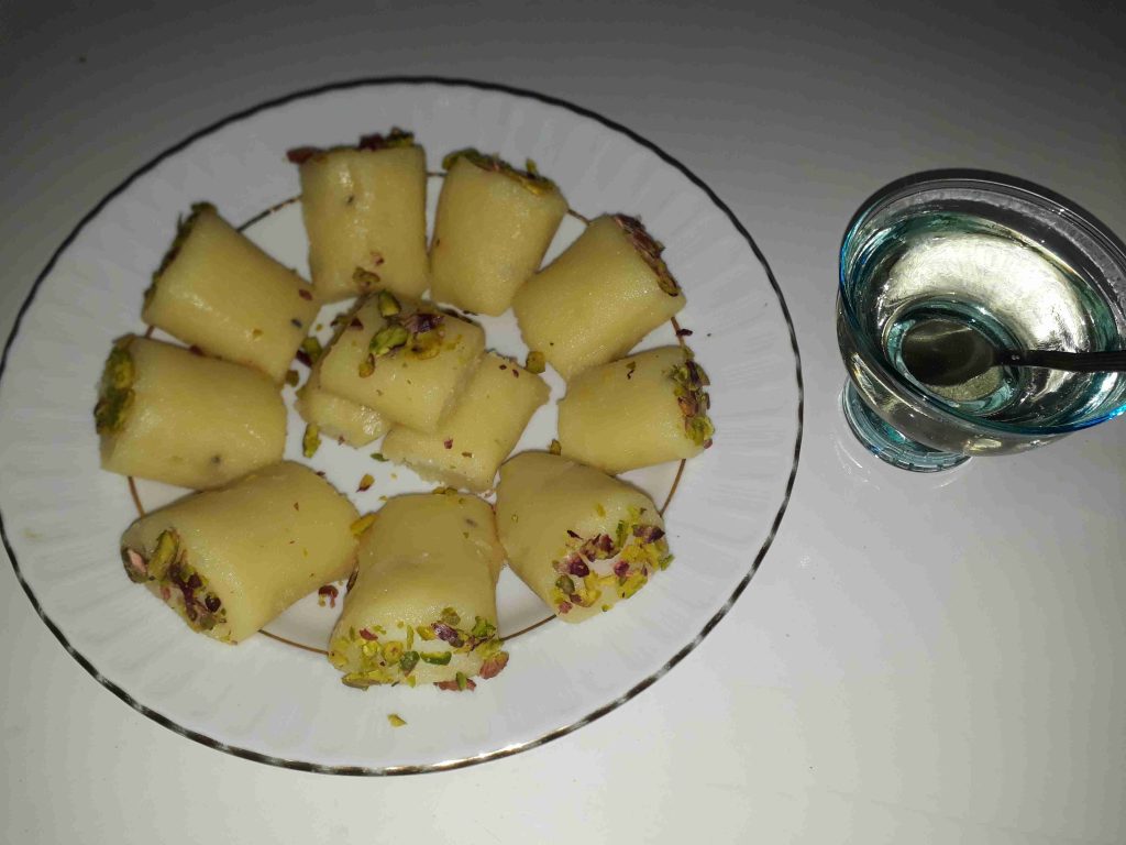 جبت نايلو مديت العجينة فوقو وحاولت اعملا كلا نفس السماكة حشيتا بالقشطة ولفيت طرف شلتو غلفتو بنايلو وكملت بقية العجينة طلعو معي تلات رولات حطيتن بالبراد ساعتين ليبرد لانو طيبتا تتقدم باردة قطعتا قطع صغار وبليتا بالفستق وحطيتا بصحن التقديم وجنبا قطر)