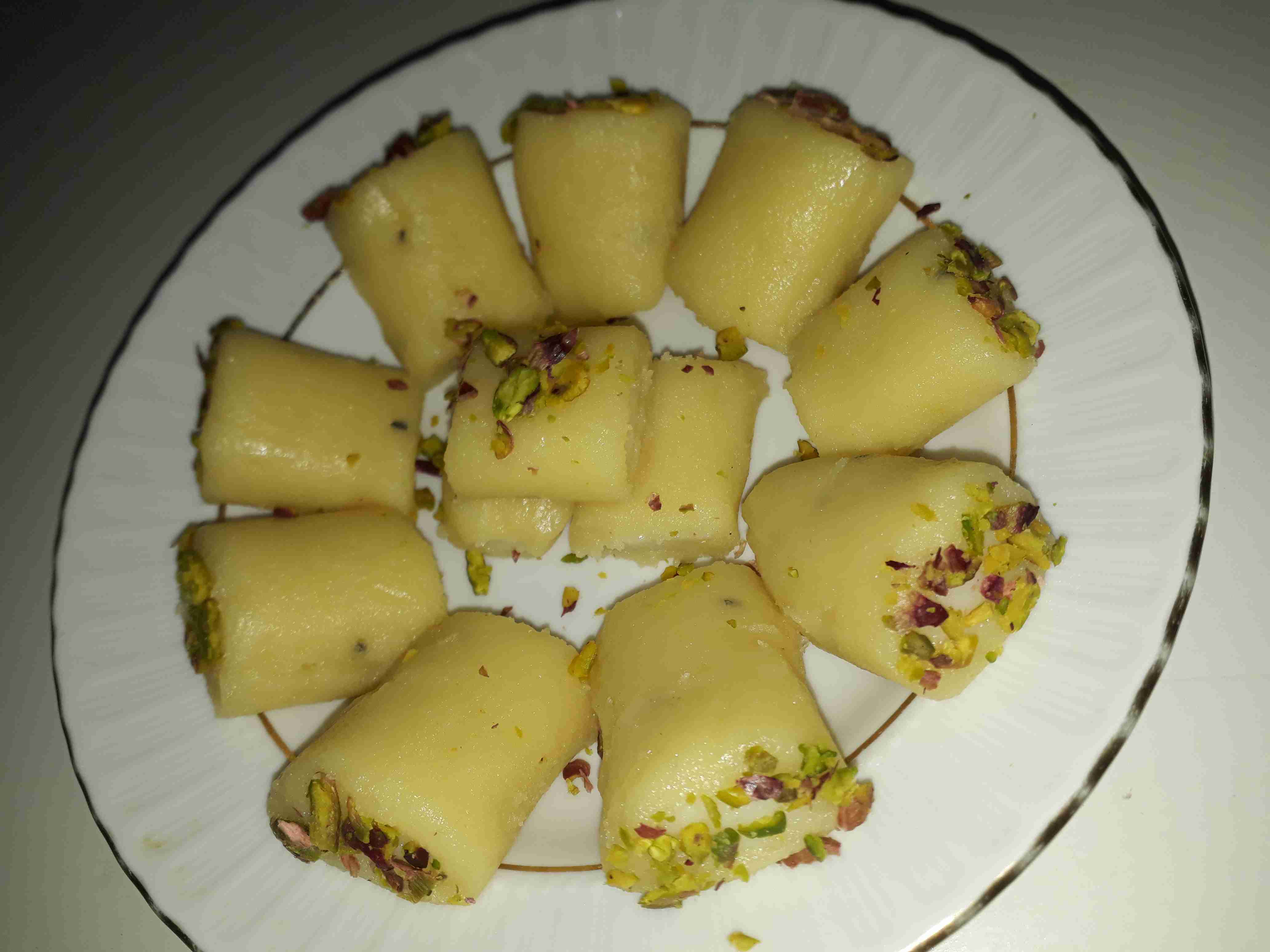 جبت نايلو مديت العجينة فوقو وحاولت اعملا كلا نفس السماكة حشيتا بالقشطة ولفيت طرف شلتو غلفتو بنايلو وكملت بقية العجينة طلعو معي تلات رولات حطيتن بالبراد ساعتين ليبرد لانو طيبتا تتقدم باردة قطعتا قطع صغار وبليتا بالفستق وحطيتا بصحن التقديم وجنبا قطر)