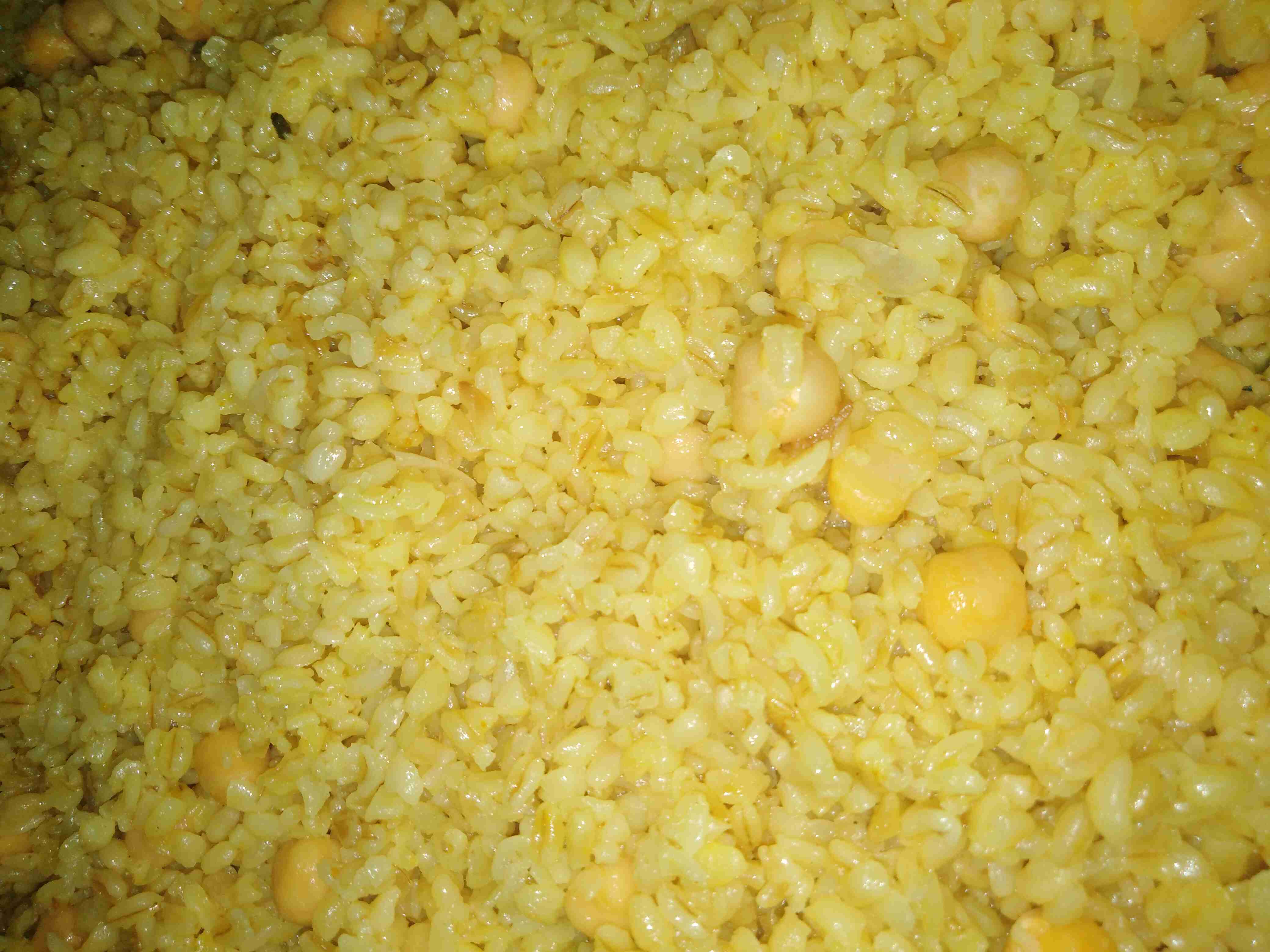 نقع البرغل ماء ساخن نصف ساعه.. بعد النصف ساعه غسله جيدا.. فرم البصل حجم وسط.. وضعه بطنجره مع زيت تقلب حتى يحمر اضافه البرغل وتقلب ثم الحمص تقلب مع وضع الكركم والملح والماجي ثم إضافه الماء ساخن عند الغليان وضع ع الوجه قصدير ونار ع الهادي بدها عشرة دقائق الاستواء اضافه زيت الزيتون ع الوجه وراحه عشرة دقايق ثم السكب في صحن التقديم وصحه وهنا.. يقدم بجانبها لبن. والسلطة..