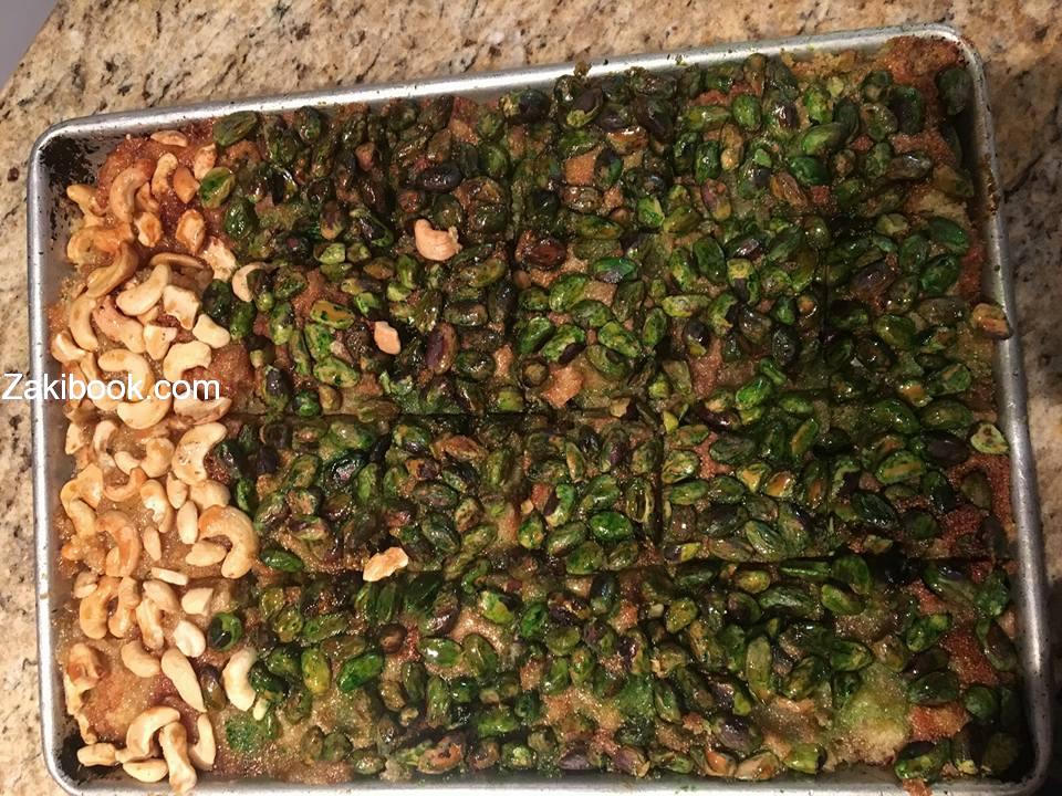 – ثم يوزع الفستق الحلبي على وجه الصينية مع الضغط عليه قليلاً بأطراف اليد.