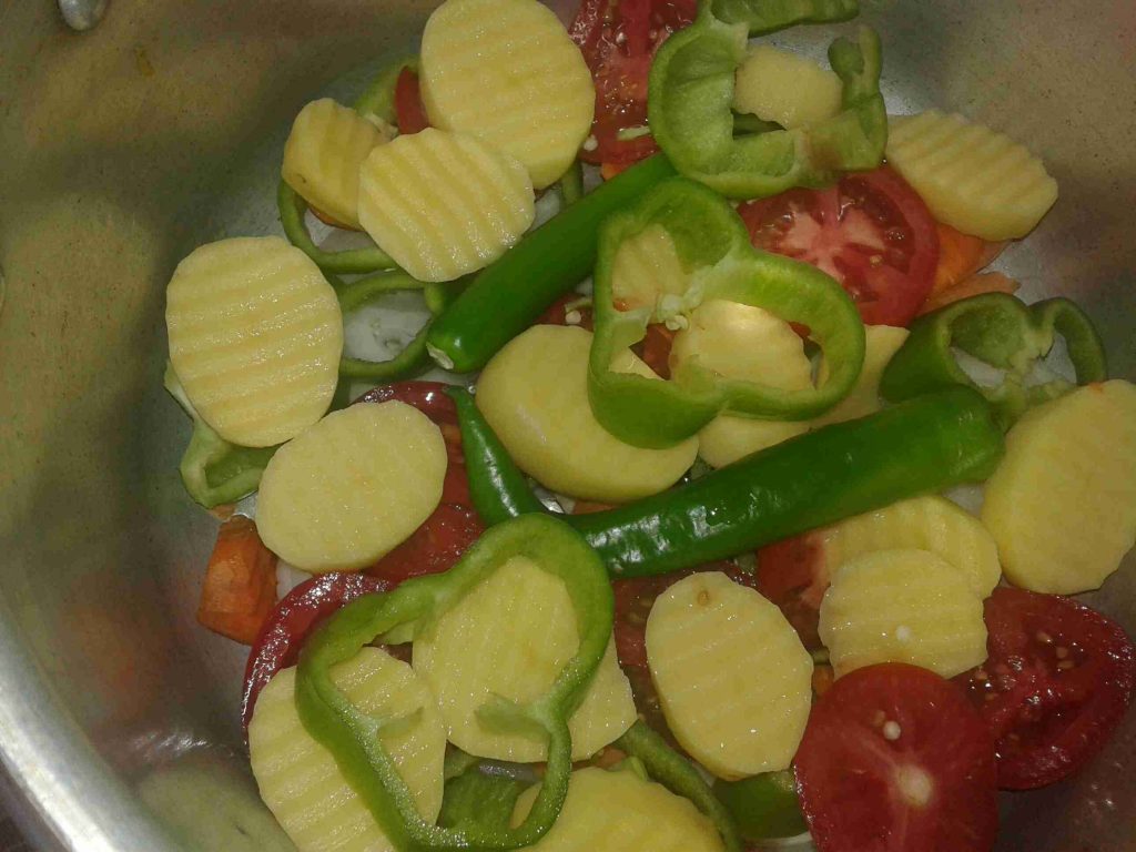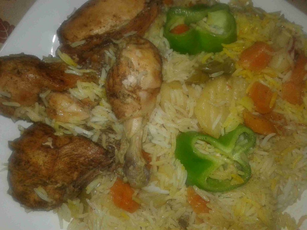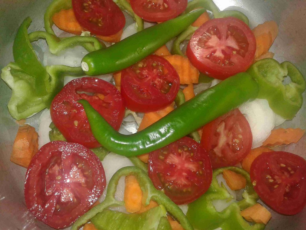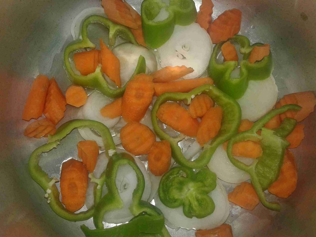 الخطوه الاولى بحضر طنجرة الضغط وبضع فيها الزيت والبصل المقطع دوائر وبضيف الحزر والفليفله والفلفل الحار والبطاطا وشرحات البندوره وبتبلهم وبملحهم وبضيفلهم الدجاج المتبل وكاسة مي سخنه ولما يغلو بسكر الطنجره وبحسبلها بعد ما تصفر بربع ساعه وطفي في هذه الاثناء بكون حطيت كمية مي على النار مع ورق الغار وعودين قرفه