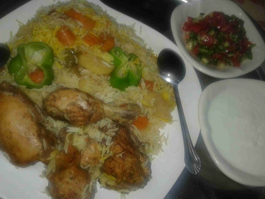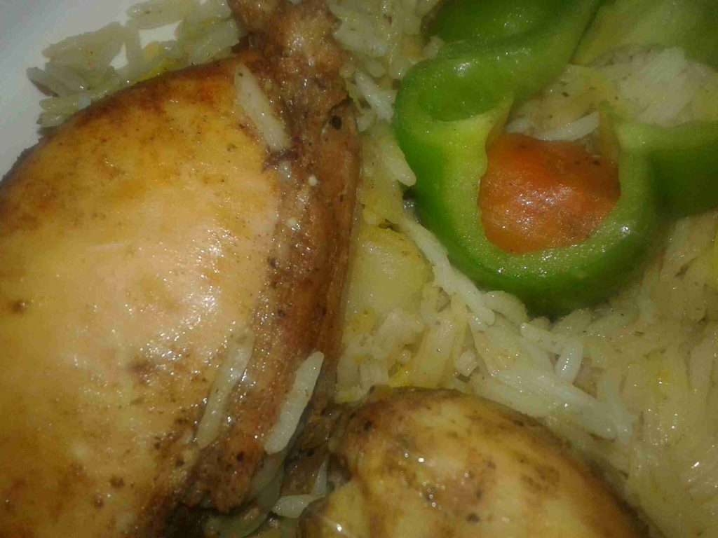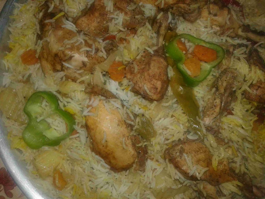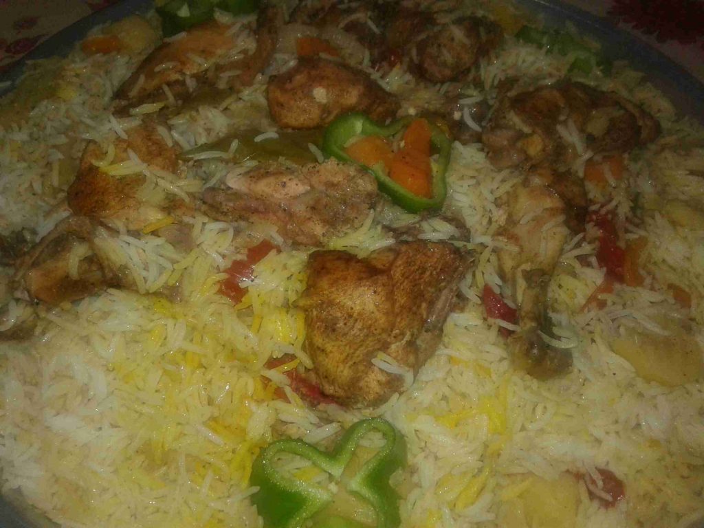 الخطوه الاولى بحضر طنجرة الضغط وبضع فيها الزيت والبصل المقطع دوائر وبضيف الحزر والفليفله والفلفل الحار والبطاطا وشرحات البندوره وبتبلهم وبملحهم وبضيفلهم الدجاج المتبل وكاسة مي سخنه ولما يغلو بسكر الطنجره وبحسبلها بعد ما تصفر بربع ساعه وطفي في هذه الاثناء بكون حطيت كمية مي على النار مع ورق الغار وعودين قرفه