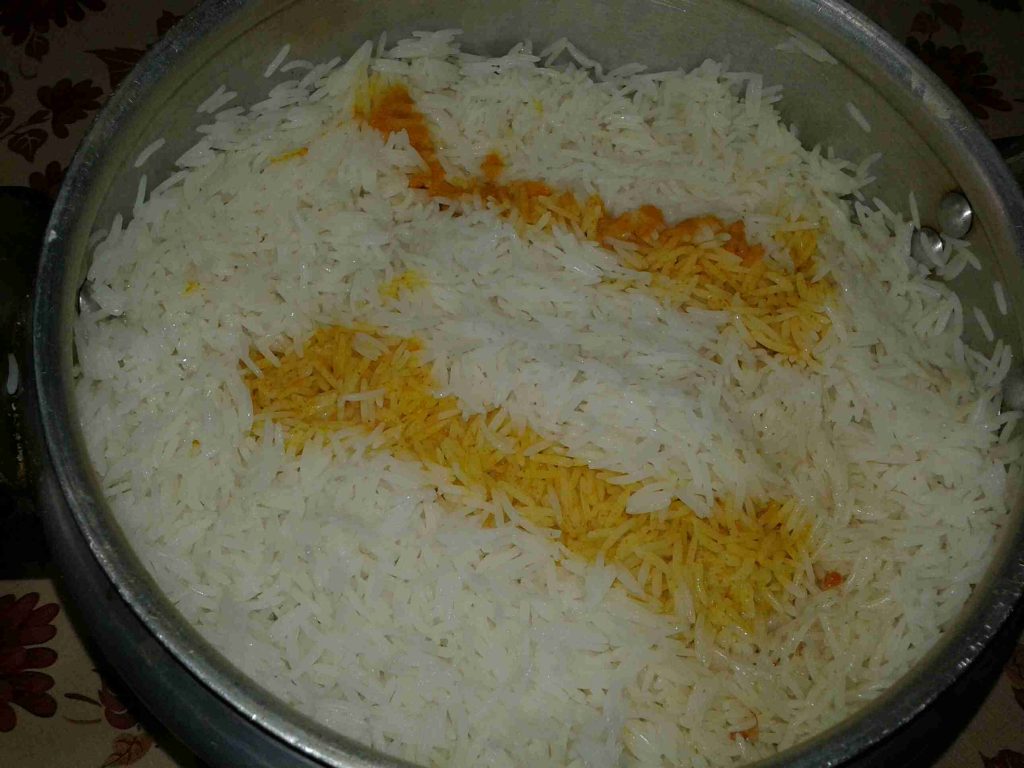 وحبات من الهيل ومعلقة ملح وشوية زيت وبضيفلهم الارز المنقوع لمدة خمس دقائق ومغسول وبتركه قبل ما ينضج بشوي بطفي الغاز وبصفي عنه المي بالمصفايه وبفتح الطنجره رح الاقي مع الخضار كميه من المي باخذ منها جزء في صحن وبتركه على جنب وبضيف الارز فوق الدجاج والخضار وبضيف عليهم صحن الشوربه الي وضعته على جنب وبدوب شوية عصفر بشوية مي وبصبها على الارز على شكل خطوط حتى احصل على ارز لونين ابيض واصفر وبغلق الطنجره ربع ساعه على نار هاديه وهيك بتكون انتهت اكلة المضغوط بتقدميها بالطريقه الي بتحبيها مع اللبن والسلطه وبتزينيه باللوز اذا بتحبي انا ما زينتها لاقيت كل الوان الربيع فيها مزينه حالها لحالها والاحمر والاخضر والاصفر والابيض بس فعلا كانت طيبه واذا جربتوها صحه وهنا مسبقا