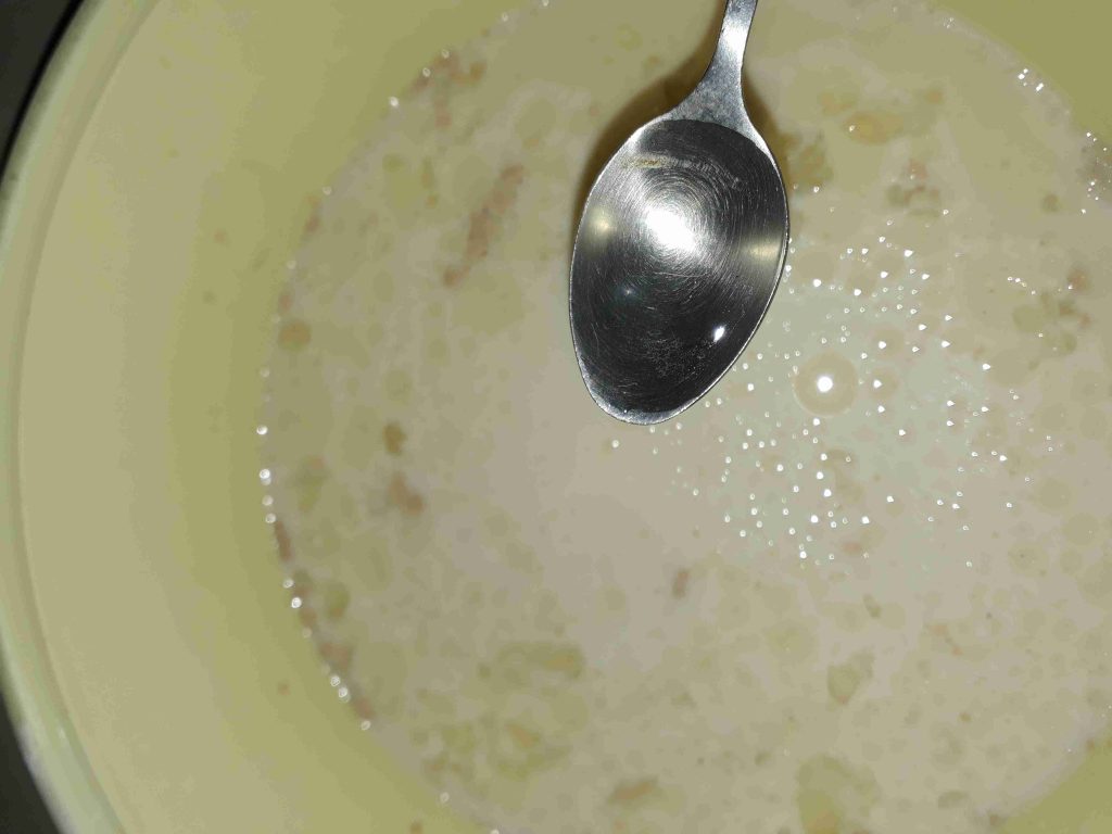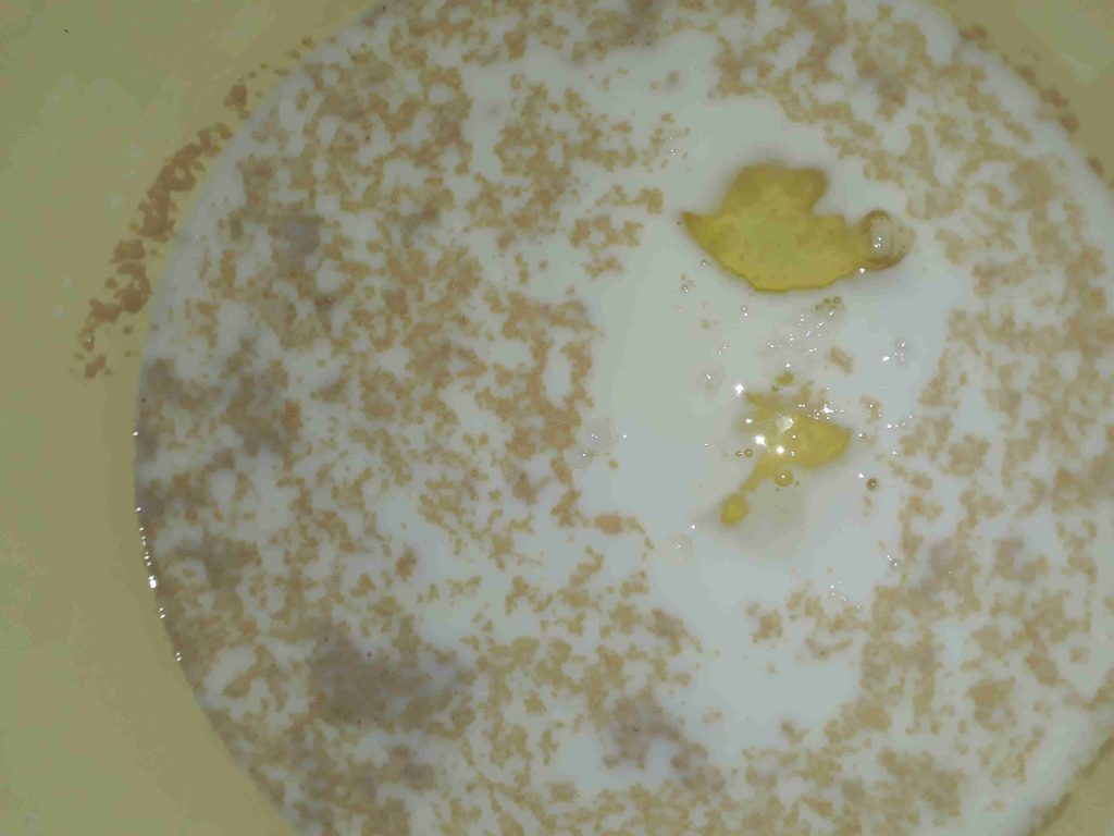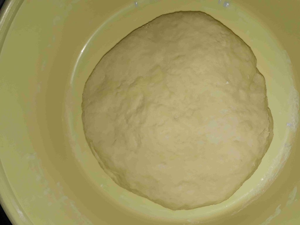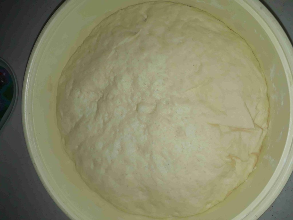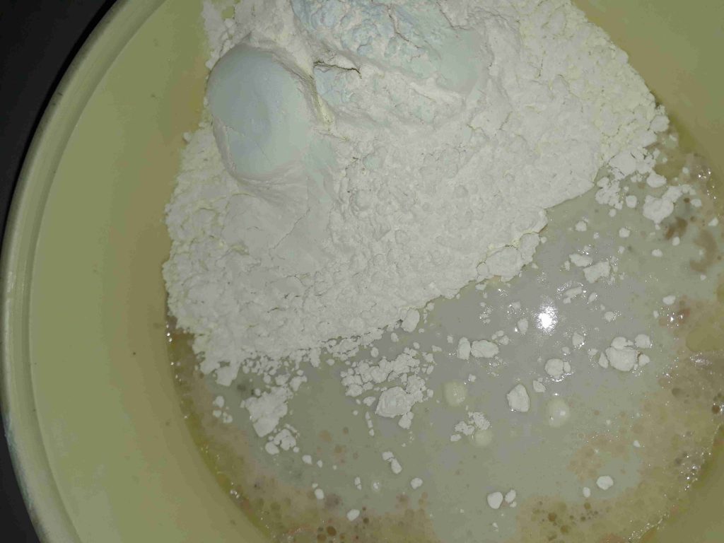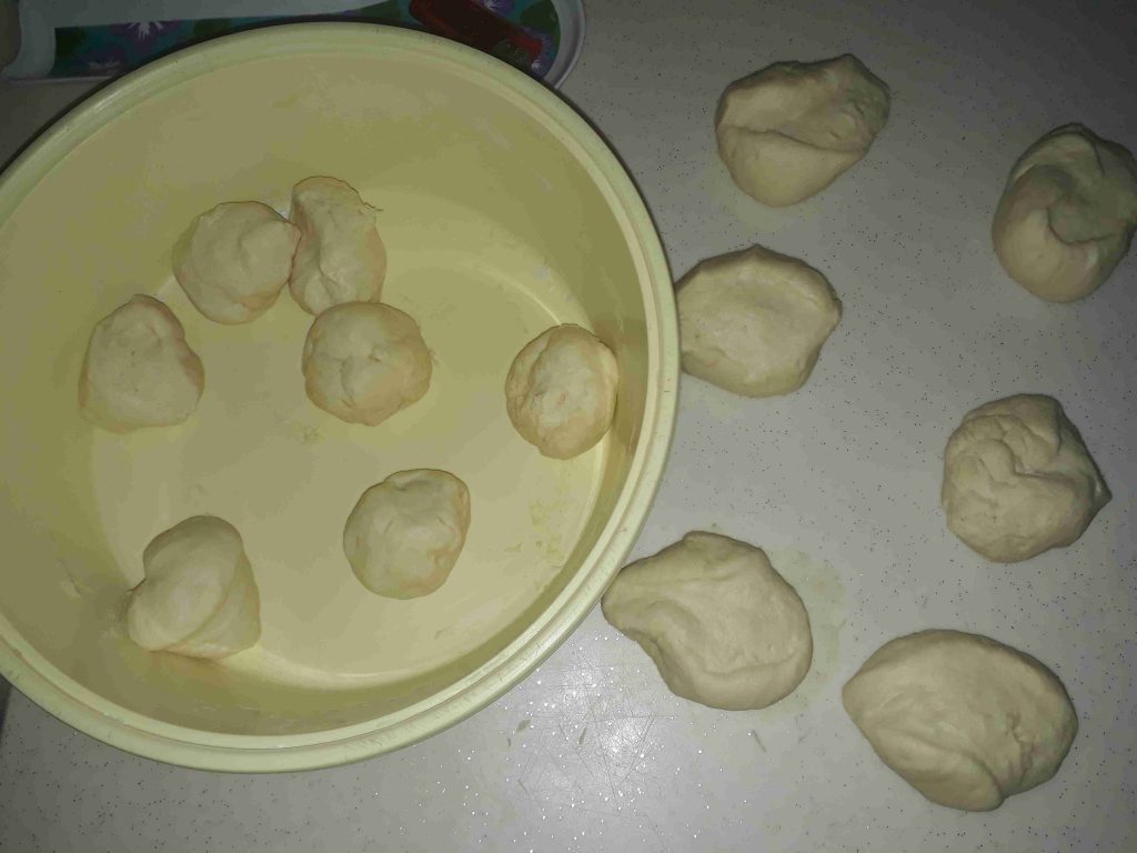 حطيت الحليب والمي بجاط ضفت فوقن السكر والخميرة وحركت ضفت بياض البيضة والزيت والخل وخلطتن ضفت الطحين لوقت التمت العجينة دعكتا مدة خمس دقايق ودهنت وجها زيت وتركتا مدة ساعة تختمر وترتاح