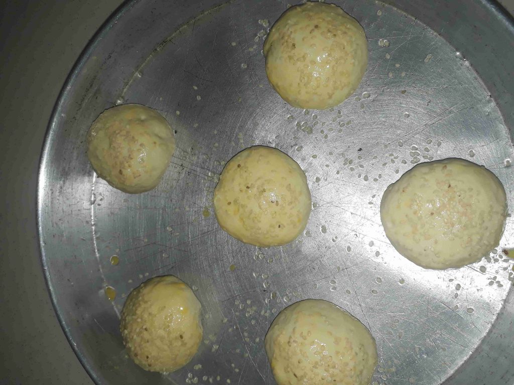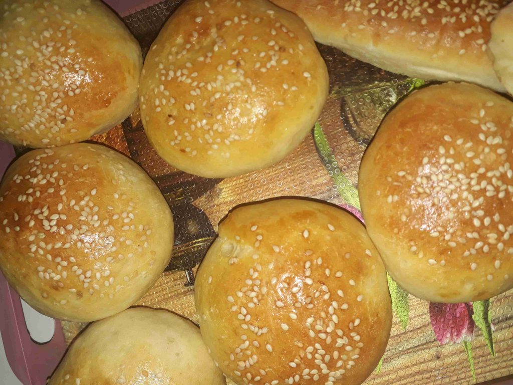 بعد ساعة قطعتا تقريبا ١٢ قطعة حسب حجم قطعة الهمبرغر الي بدكن تركتا عشر دقايق بعد ماقطعتا خلطت صفار بيض مع شوية حليب وخل ودهنت وجها رشت سمسم ودخلتا لفرن حاااااامي اذا بارد او دافي رح تنشف ونحن بدنا ياها طرية اخدت عشر دقايق وكانت خالصة طالعتا من الفرن وغطيتا بكيس نايلو او منشفة وهي كانت وصفتي لليوم واستنوني بوصفة الهمبرغر ههههه