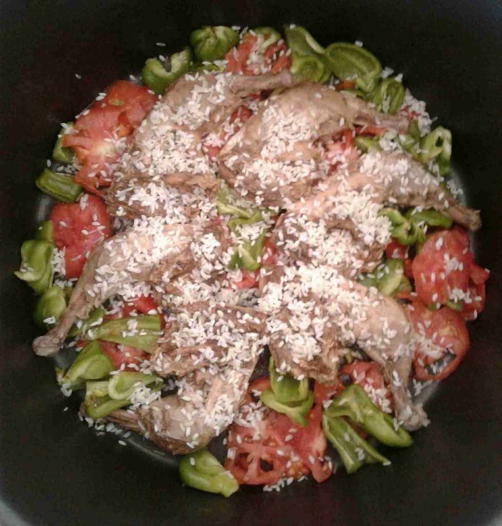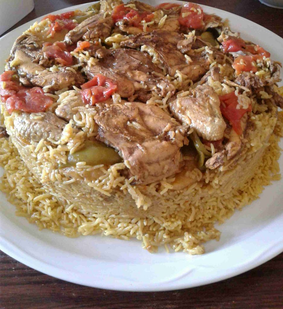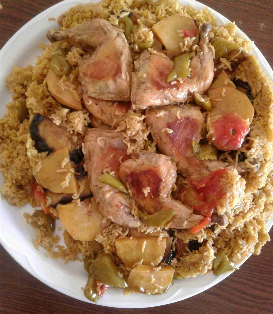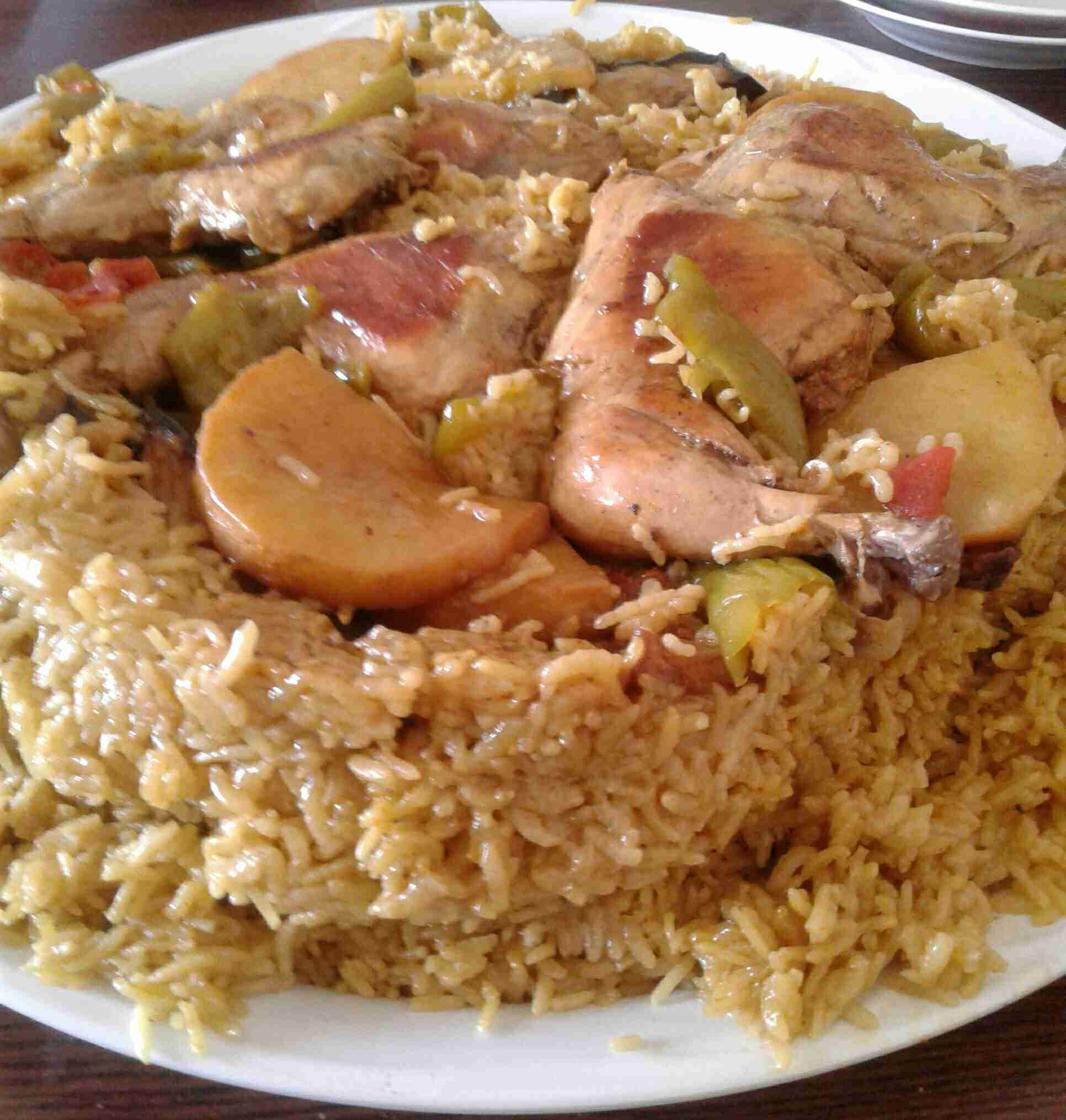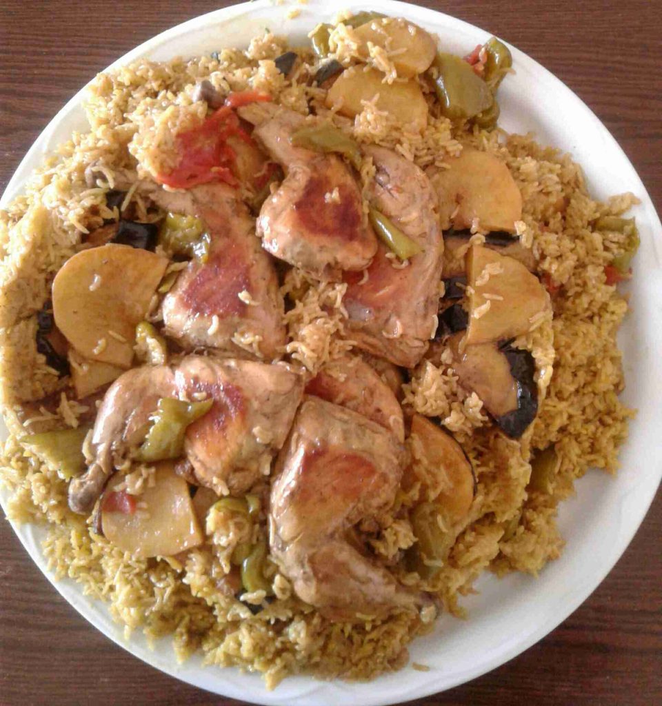 – نرتب شرائح من الطماطم والفلفل الأخضر أسفل الطنجرة ونرتب فوقها الدجاج (أو بالعكس) ، ونرتب فوقه الخضار المقلية ، ثم نضيف طبقة الأرز المنقوع والمبهر .