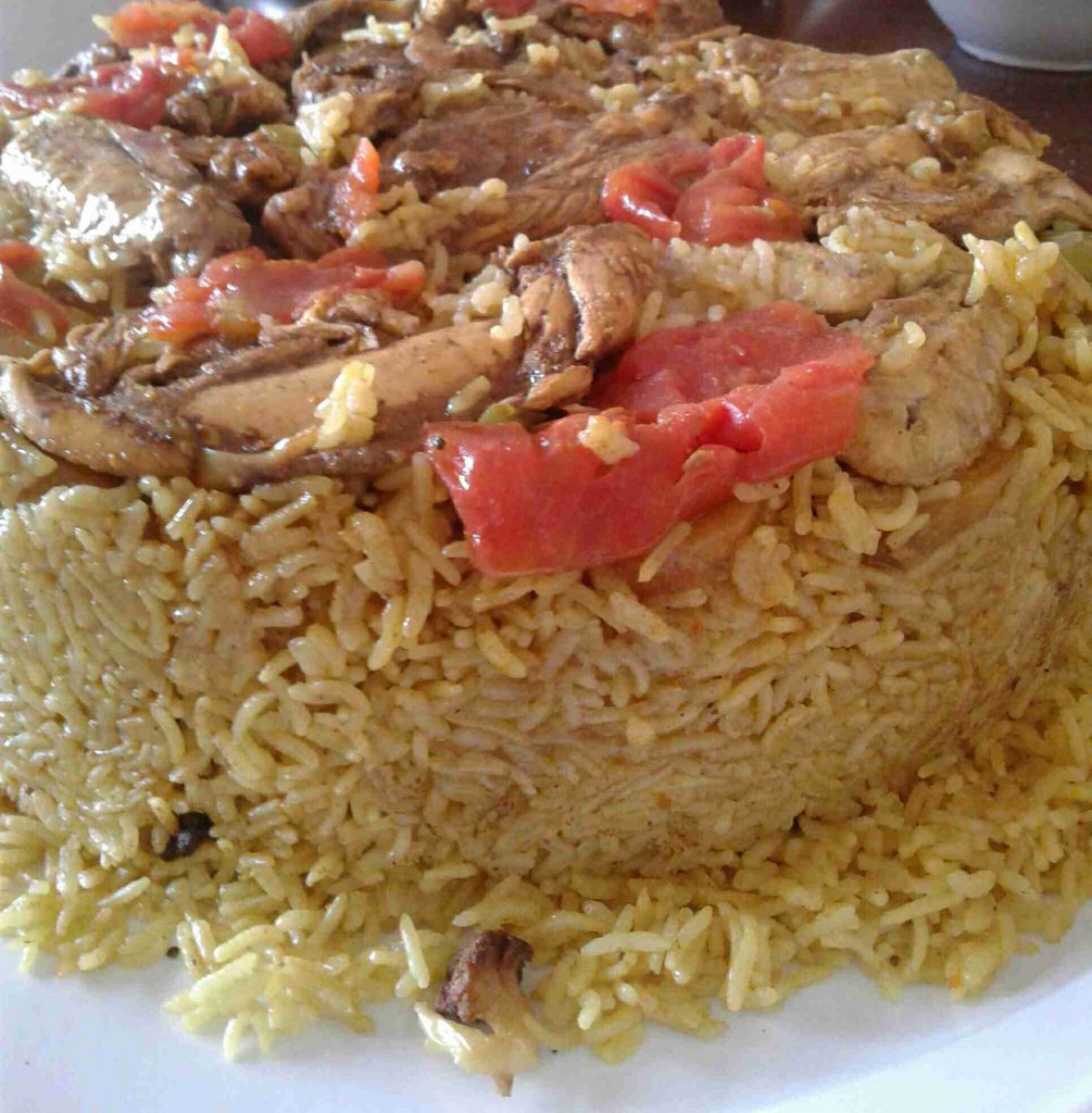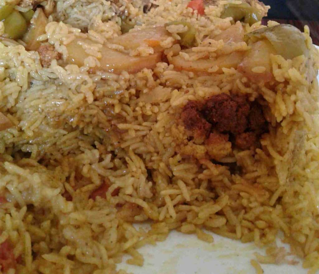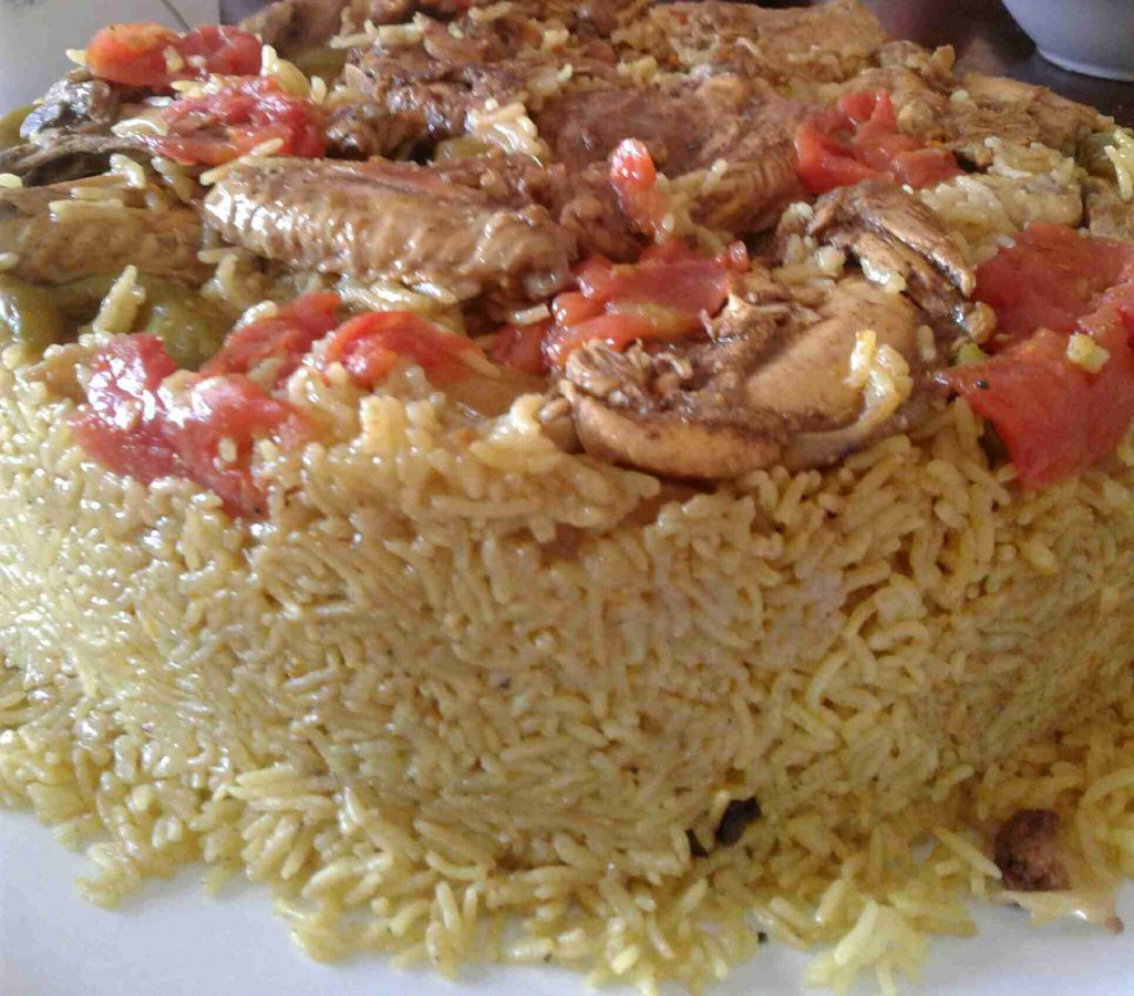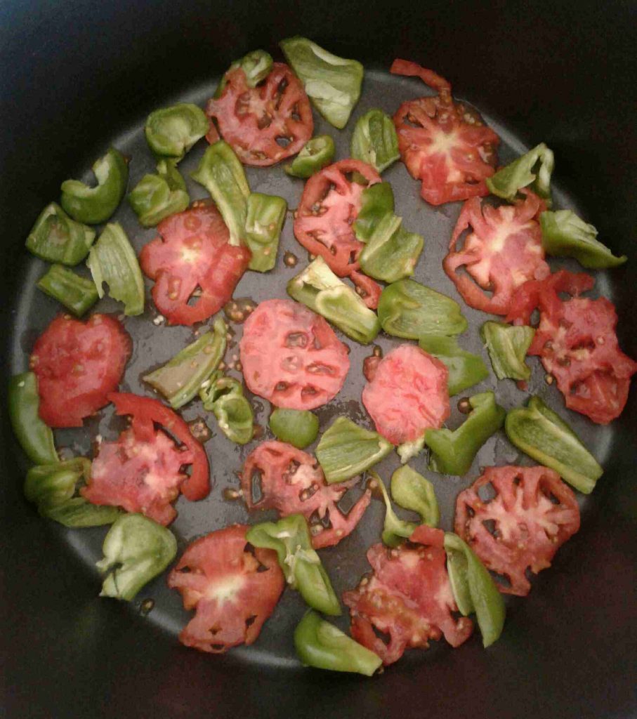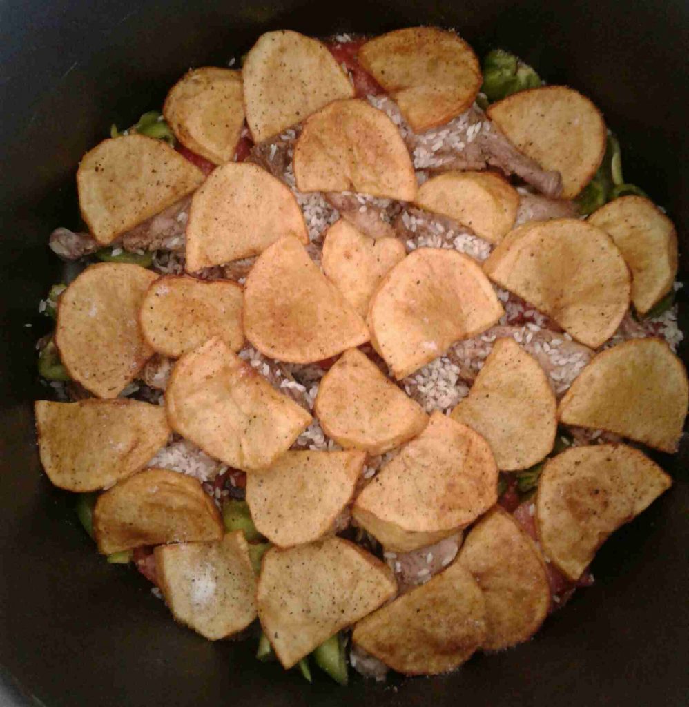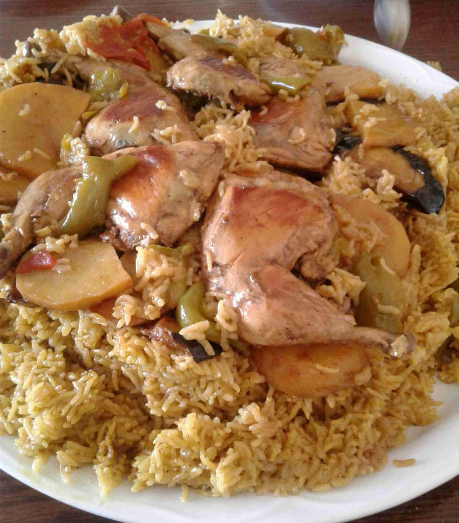 – نرتب شرائح من الطماطم والفلفل الأخضر أسفل الطنجرة ونرتب فوقها الدجاج (أو بالعكس) ، ونرتب فوقه الخضار المقلية ، ثم نضيف طبقة الأرز المنقوع والمبهر .