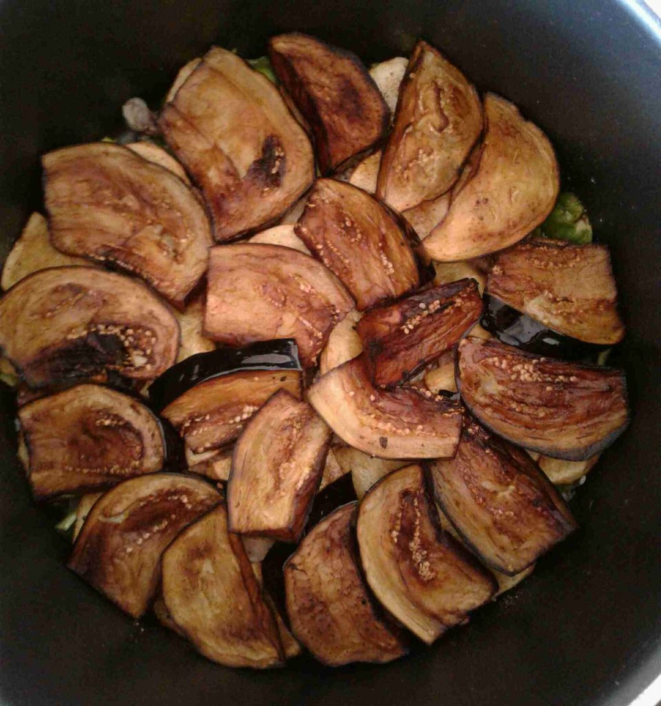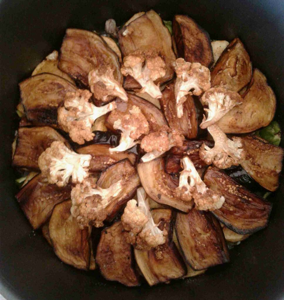 – في هذه الأثناء : نجهز الخضراوات ونغسلها ونجففها قبل قليها ، تقطع بأحجام كبيرة نوعا ما ، ثم تقلى في زيت غزير على حرارة عالية بشكل جزئي لتأخذ لونا مميزا ، ولا داعي لنضجها تماما لأنها ستطبخ لاحقا مع الأرز ؛ تصفى من الزيت الزائد وتترك جانبا لحين تجميع وتطبيق المقلوبة .