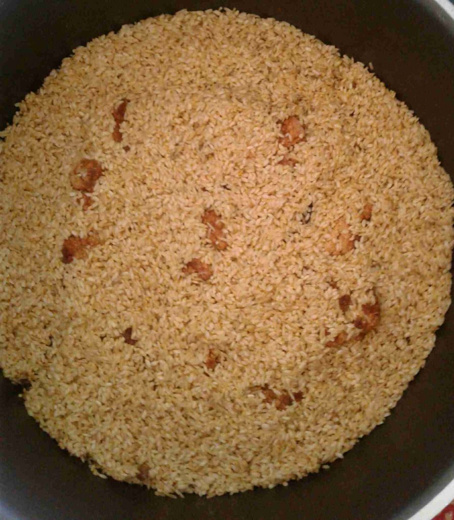 – يصفى الأرز المنقوع جيدا .. ثم يضاف له القليل من الملح وملعقة صغيرة من الفلفل الأسمر ومثلها من البهار العادي والقرفة الناعمة والهيل المطحون ناعم والعصفر ، والقليل من الزيت الذي قلينا به الخضار (يعطيه لمعة ونكهة مميزة) ويخلط الأرز مع المنكهات ويترك جانبا ، ويمكن إضافة ملعقة صغيرة من البن (القهوة) لإعطاء نكهة ولون مميزين ، ويمكن خلط الأرز المنقوع والمصفى مع الشعيرية المحمصة مسبقا ، طبعا هذه الإضافات حسب الرغبة.