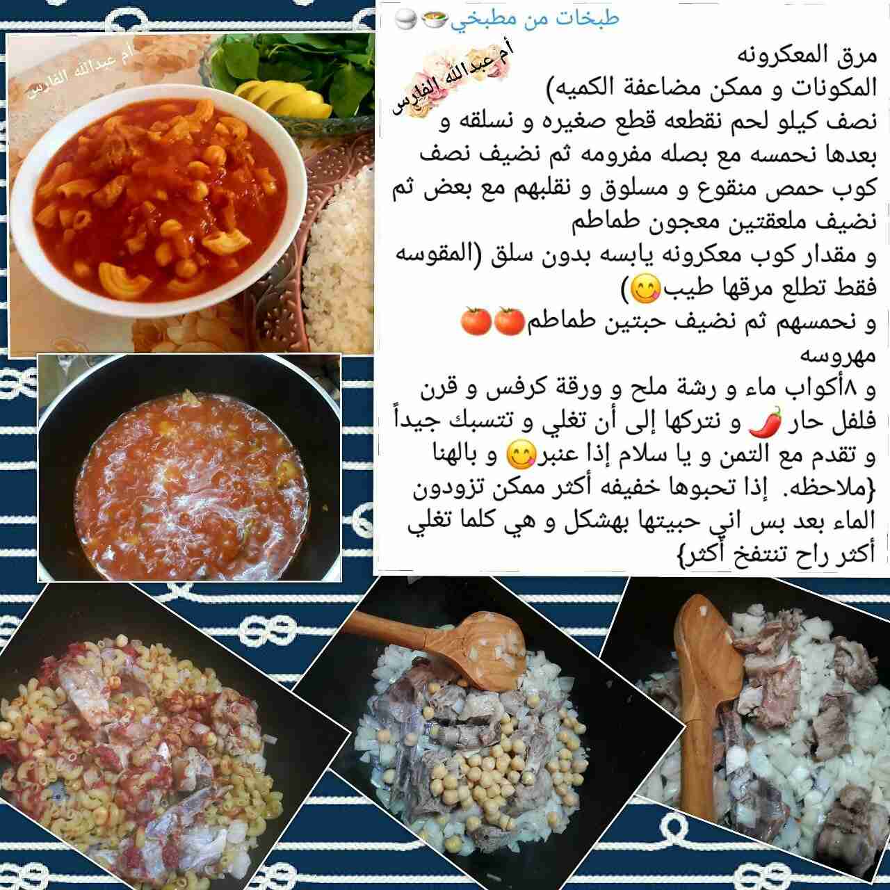 السلام عليكم ورحمة الله// اليوم حابه انزل اكله قديمه تعلمتها من أمي الله يحفظها و يطول بعمرها يارب / و هي مركَة(مَرقة) المعكرونه.. طبعاً هالأكله كلش أحبها و الها ذكريات بقلبي. لأن يوم كنا زغار مو كثير نطبخ المعكرونه أو نعرف الها طرق طبخ متنوعه. فكانت امي لما أبويه يجيب معكرونه تطبخها بالغدا مركَه و بالعشا تطبخها بطريقه ثانيه ح أنزلها قريبا إن شاء الله و يا رب تجربوها و تعجبكم و اللي يعرف هالطبخه او ماكلها ينطينا رأيه بيها
