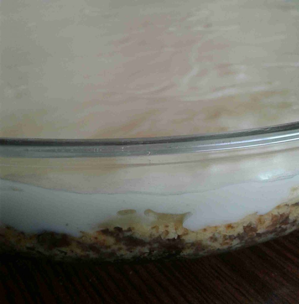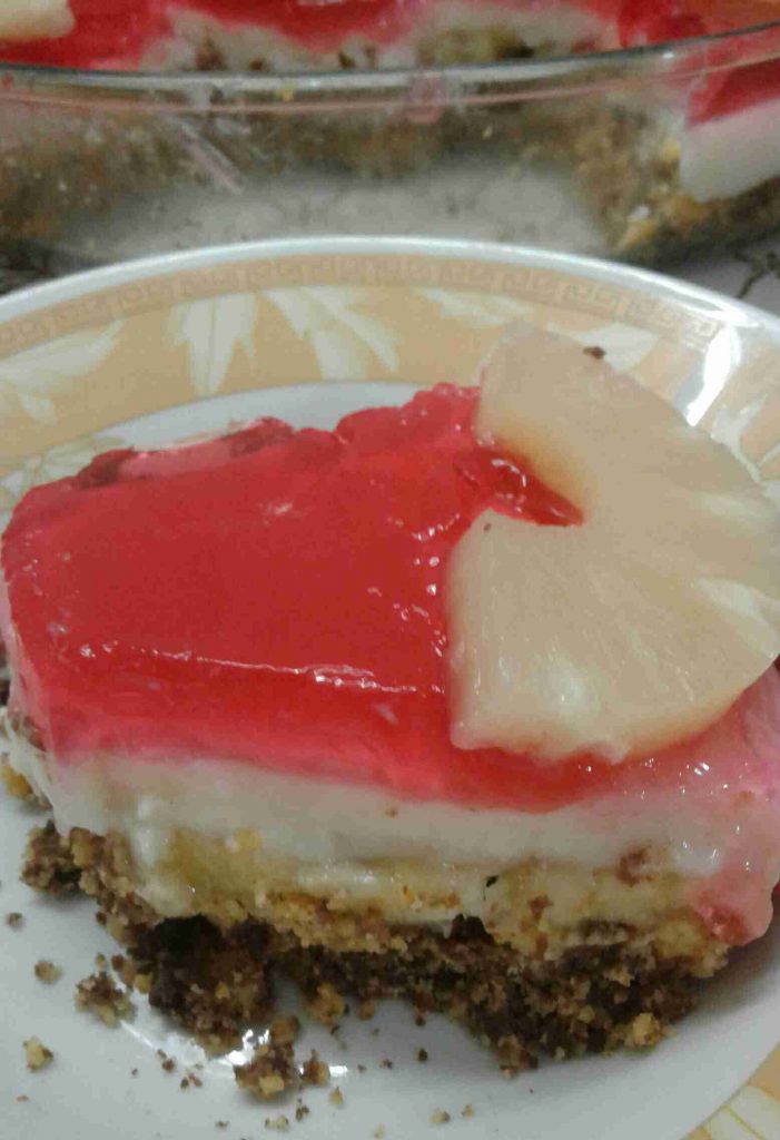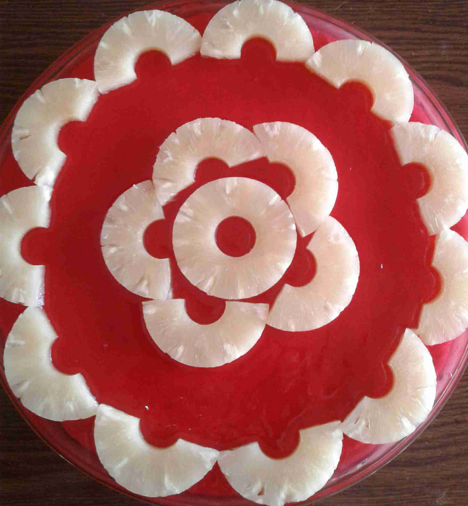 – في هذه الأثناء : نحضر الجيلي كما هو موضح على العلبة ، وننتظر خمس دقائق ثم نضيفه فوق القشطة في الجاط ، ونضعه في الثلاجة حتى يجمد تماما ، ونزينه بشرائح الأناناس. ويقدم.