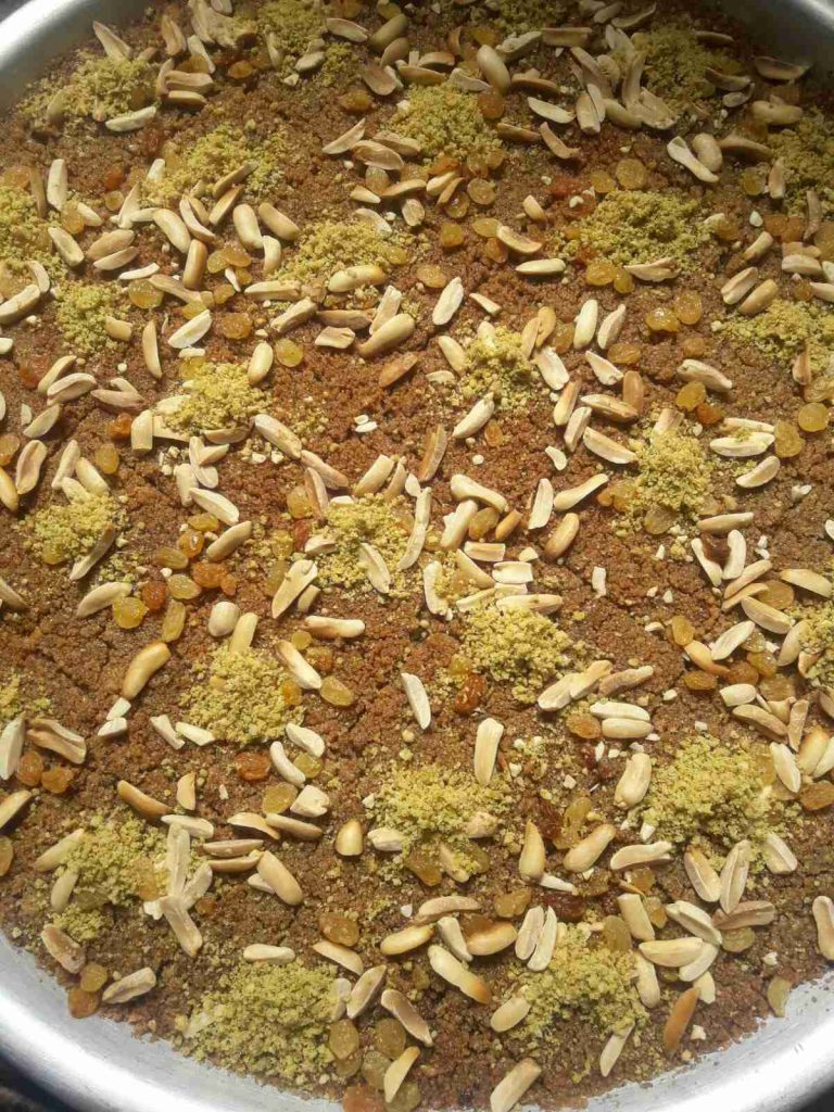 في وعاء يتم خلط المواد الجافه معا جيدا السميد والطحين والسكر والحليب ورشه الملح بنضيف السمنه والميه وبنحركهم كويس الخليط بكون شبيه بخليط الكيك بس تقيل بتصبيه بصينيه مدهونه سمنه وبتحطيه بفرن على نار هادئة من فوق بس لتنشف العجينه ما بدنا إياها تتحمر بس لتصير ناشفه بعدها بنكسرها قطع صغيره وبنطحنها على محضره الطعام لتصير زي حبات المفتول بعد ما نخلص كل الكميه بنضيف عليها معلقتين كبار قرفه ومعلقتين سمنه وبنفركهم مع بعض كويس
