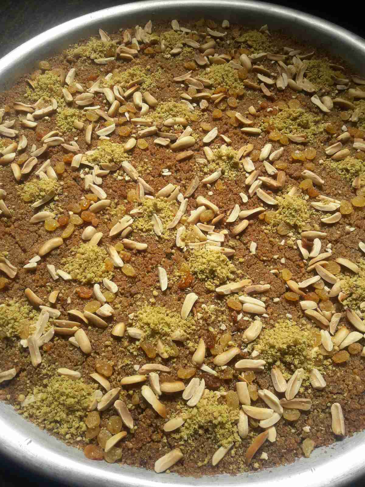 في وعاء يتم خلط المواد الجافه معا جيدا السميد والطحين والسكر والحليب ورشه الملح بنضيف السمنه والميه وبنحركهم كويس الخليط بكون شبيه بخليط الكيك بس تقيل بتصبيه بصينيه مدهونه سمنه وبتحطيه بفرن على نار هادئة من فوق بس لتنشف العجينه ما بدنا إياها تتحمر بس لتصير ناشفه بعدها بنكسرها قطع صغيره وبنطحنها على محضره الطعام لتصير زي حبات المفتول بعد ما نخلص كل الكميه بنضيف عليها معلقتين كبار قرفه ومعلقتين سمنه وبنفركهم مع بعض كويس