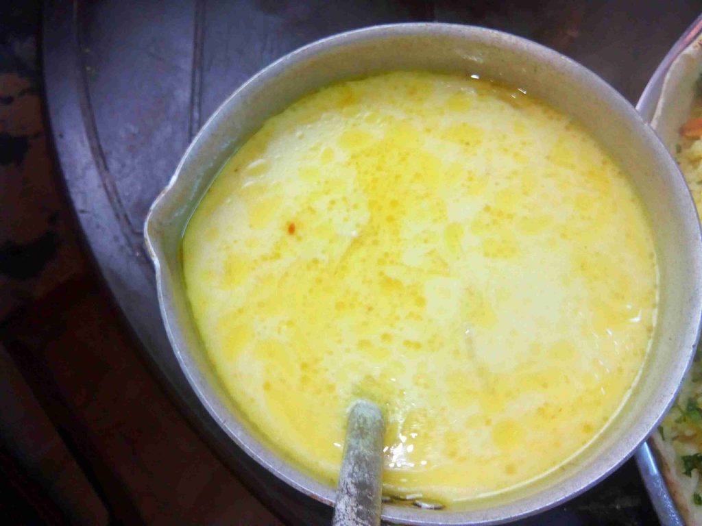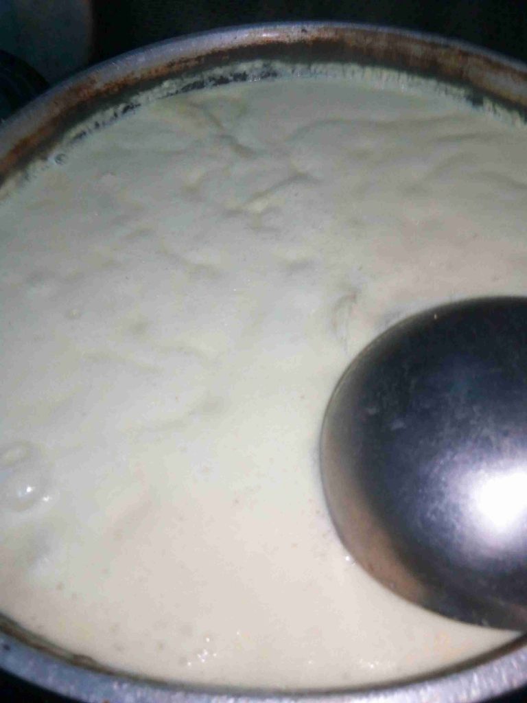 وبنغلي اللبن وبنسقط اللحمة أو الجاج وبنستمر بتحريك اللبن لحتى يبلش يفور وينسف ومن هون إجى إسم المنسف وبنخليه يغلي ليثقل ويستوي الجاج أو اللحمة منيح