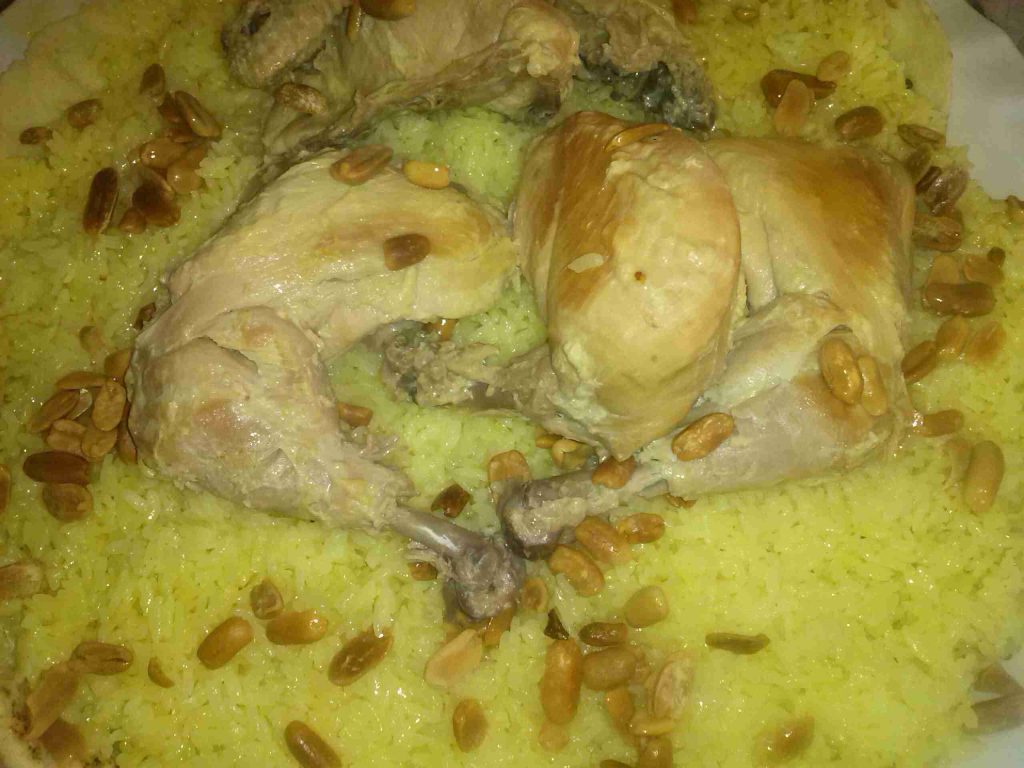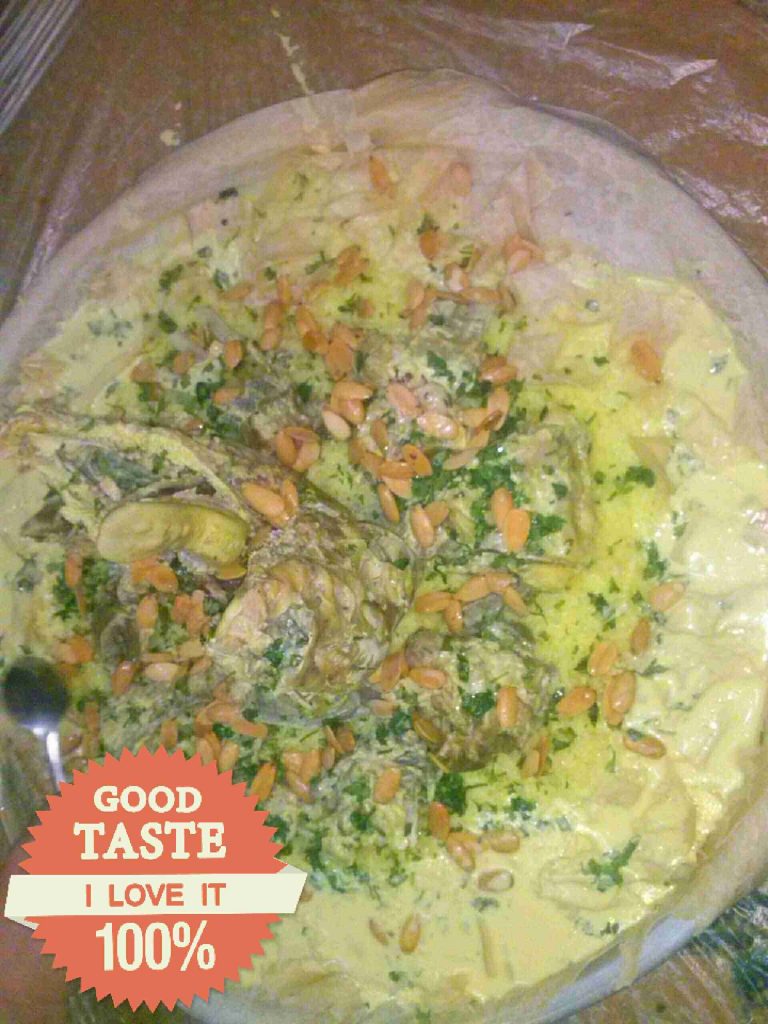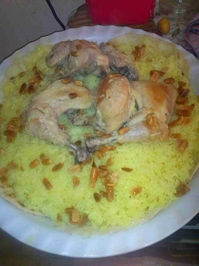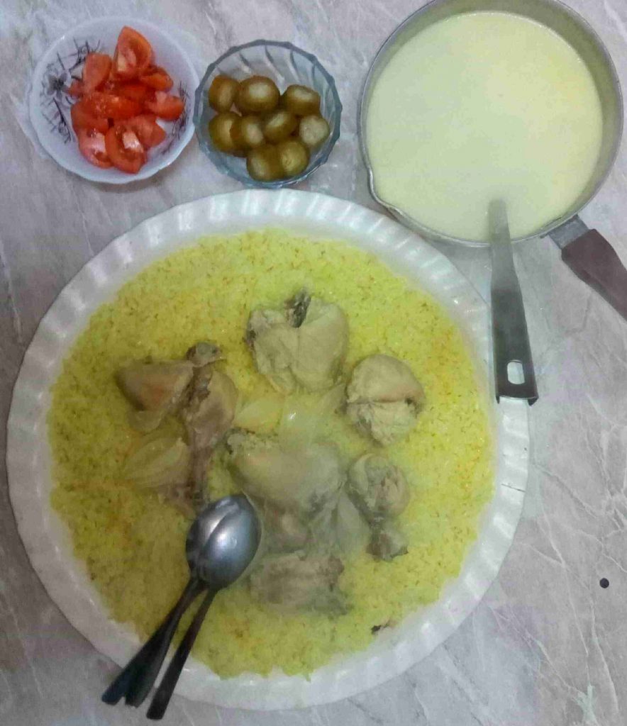 وقت التقديم بنفت خبز شراك بالصينية أو السدر أو بنحطه كامل أو خبز عادي إذا كان طبخه للعيلة وبنشربه من اللبن وبنحط الرز فوقيه وبعدين نرتب قطع الجاج أو اللحم وبنزينه وسلامتكم