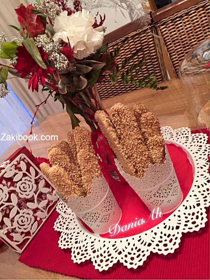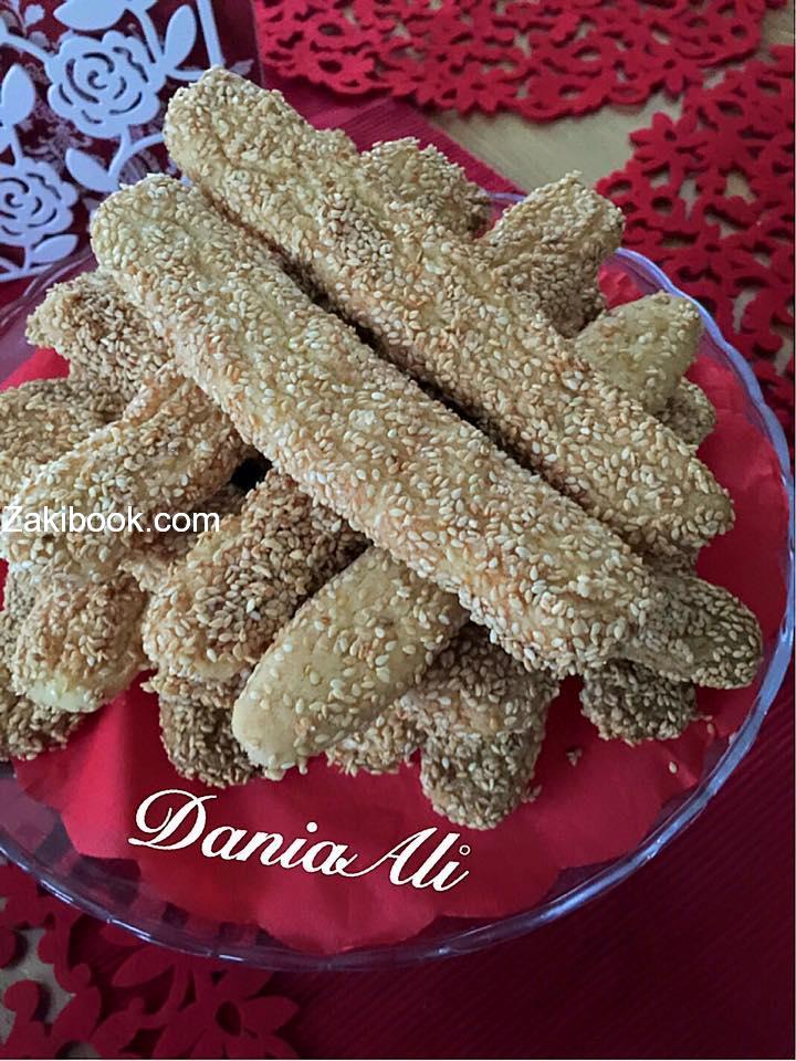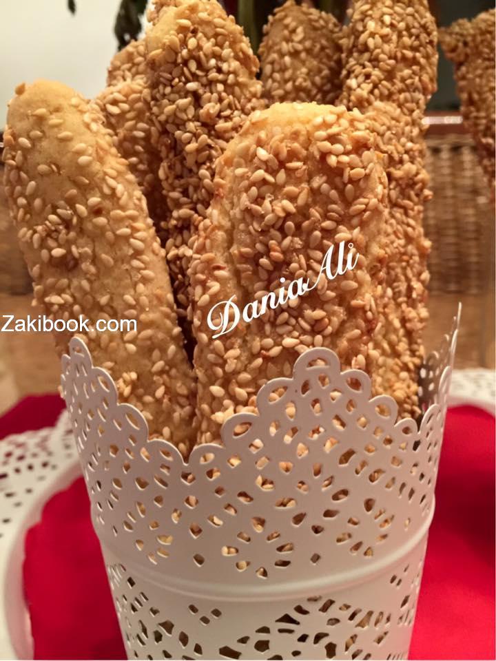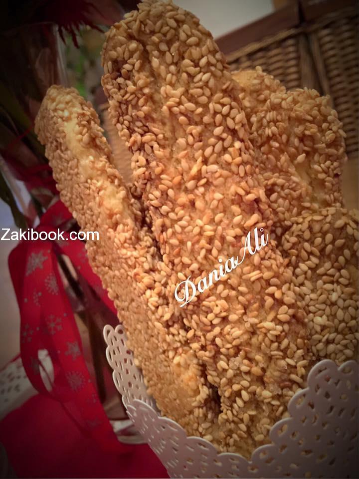 – ثم نأخذ العجينة ونعمل منها أصابع طولية ، ونغمسها ببياض البيض ، ونمررها بخليط السمسم المحمص المخلوط بقليل من السكر ، وترص بصينية الفرن وتكون مدهونة جيداً ، أو نضع ورق الزبدة بدل دهنها .