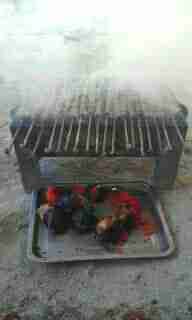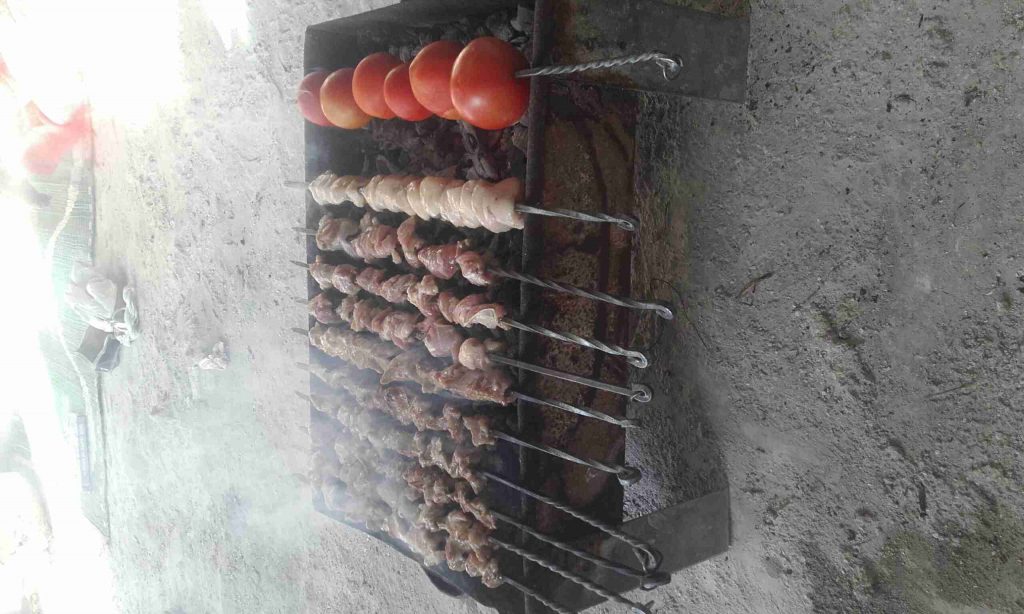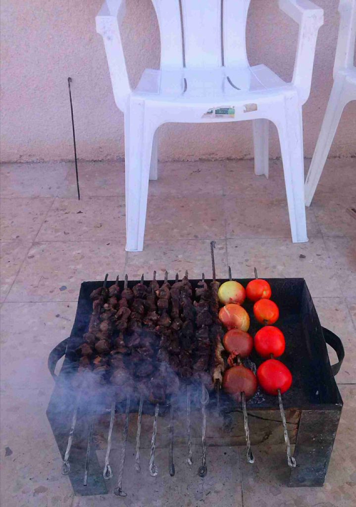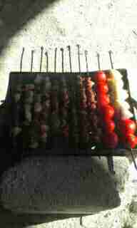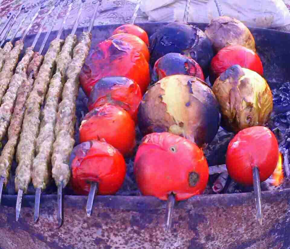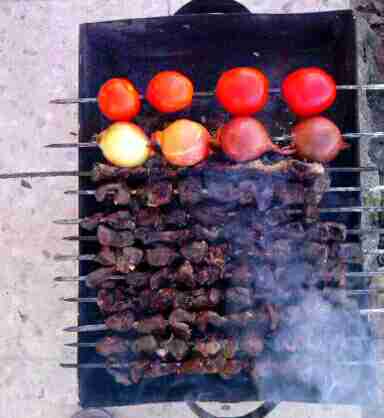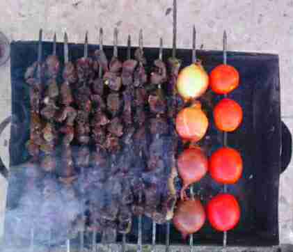 وبتكون جاهزة للشوي برتبها عالمنقل وبسياخ تانية بحط حبات بصل وبندورة وبشويها مع اللحمة والكبدة وننتبه ما تنحرق بنقلبها عالجهتين وبنراقب الجمرات الفحمات يعني لحد ما يستوا بنحطهم بخبز مشروح أو عادي مع البندورة والبصل المشويات والكباب كمان وياااا سلاااام مع لبن رايب بس