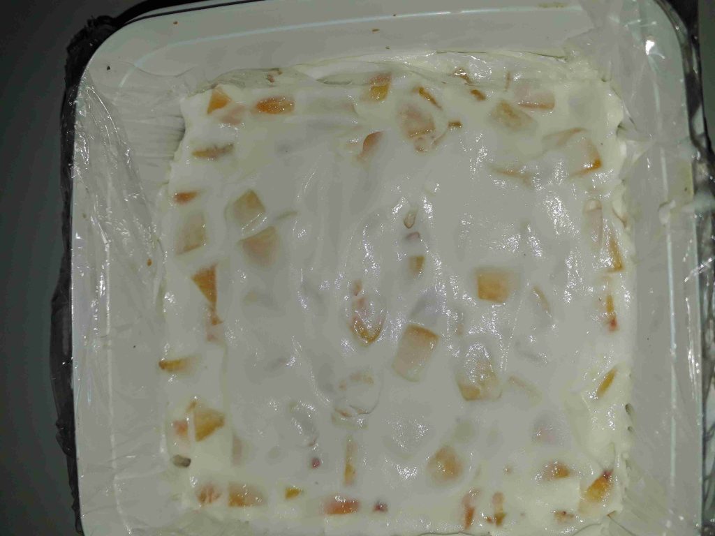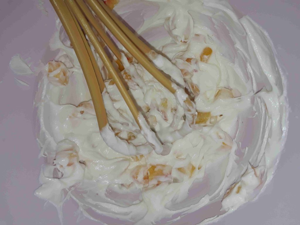 خفقت الكريمة بالحليب وفرمت خوختين مكعبات ناعم وخلطتا مع الكريمة
