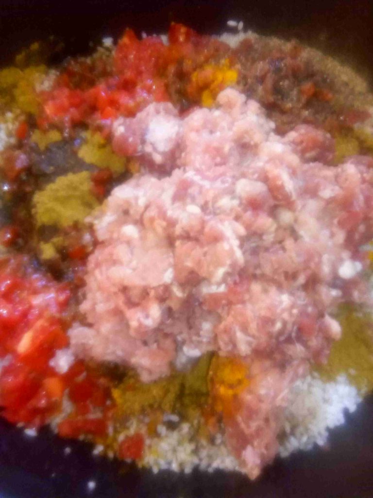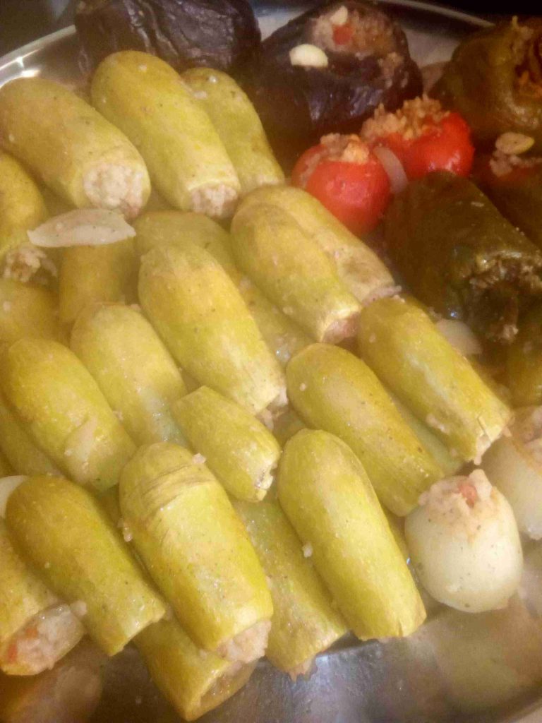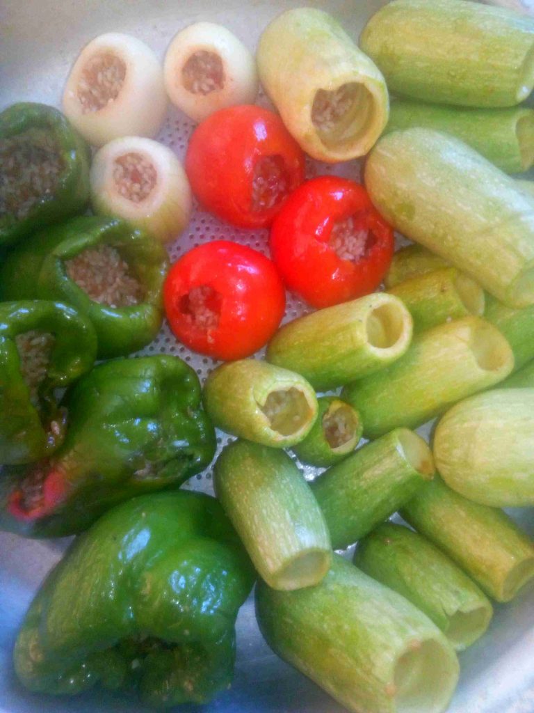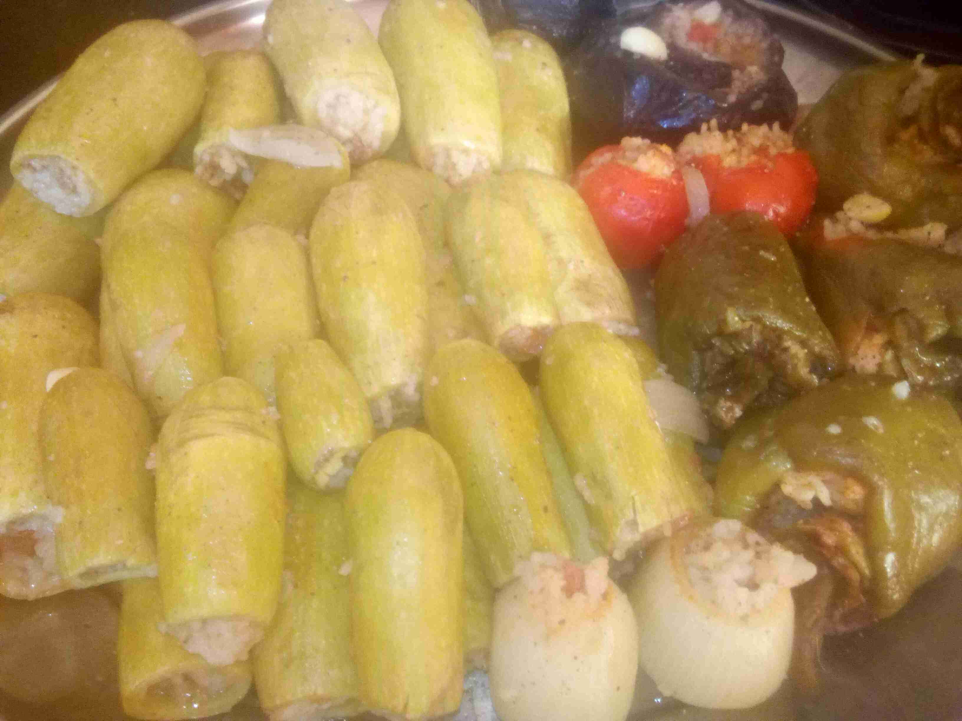 بنجيب الخضار وبنحفرهم كلهم بغد طبعا بعد ما نغسلهم منيح بعدين بنجهز الحشوة بعد ما ينقع الرز بغسله وبصفيه وبحطله اللحمة المفرومة والبهارات والملح والفلفل والزيت وفرمت معها شوية بندورة كمان وبخلط الحشوة منيح