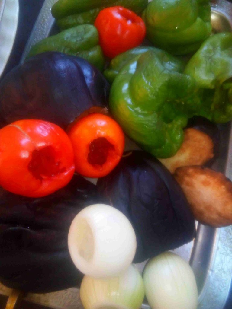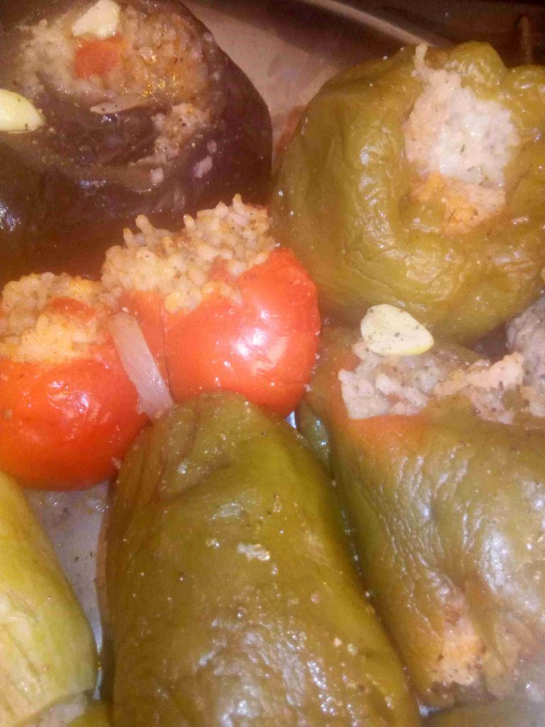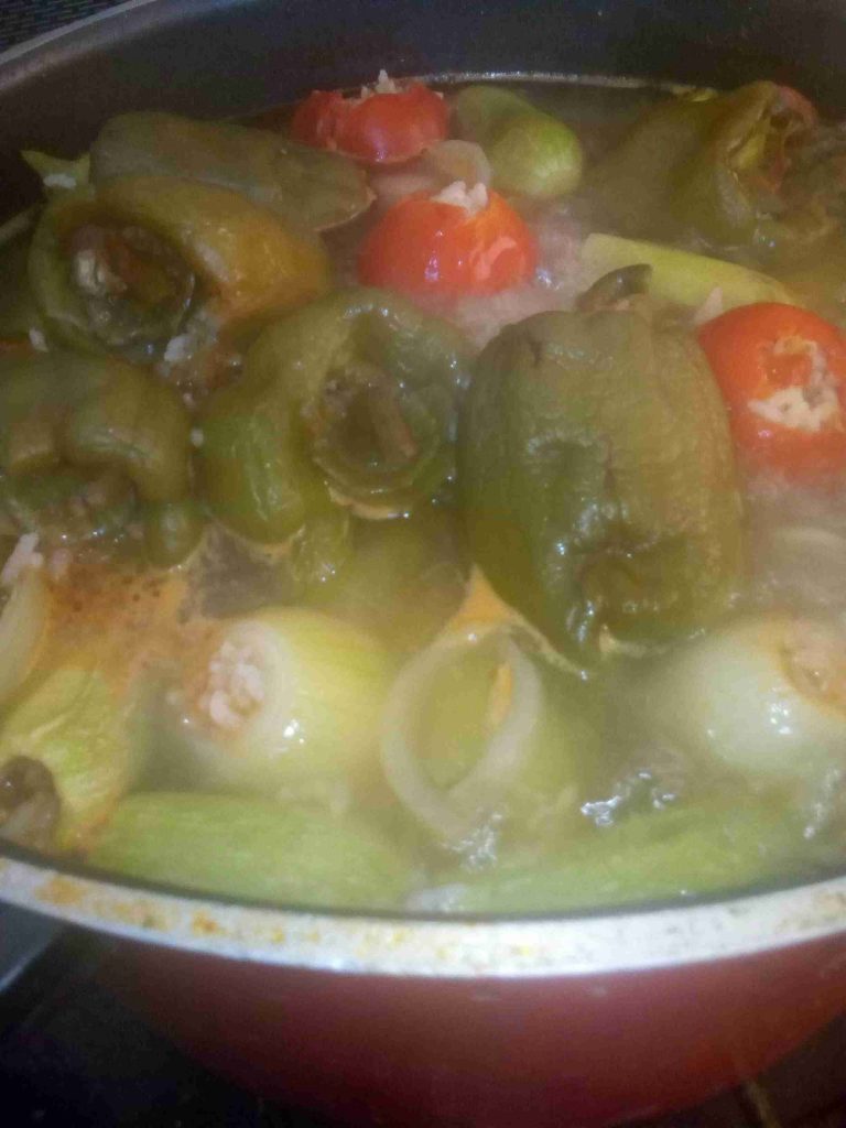 بعدين بنحشي الخضار كلها وبحط شرحات بصل وثوم بالطنحرة وبصفط فيها الخضار وبضيفلهم مي مع ثلاث معالق مية بندورة بس للطعمة وبحطهم لينطبخوا عالغاز طبعا طعم هاي الخضار المحشية كلها مع بعض كتير زاكية وبعد ما يستوا بقدمهم