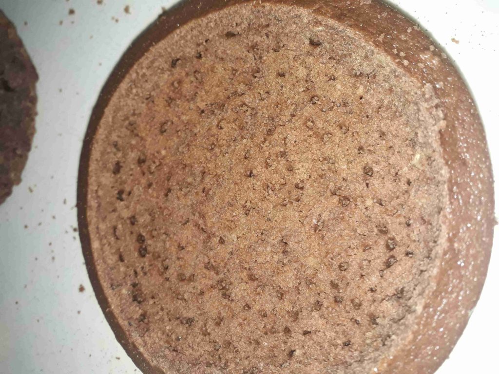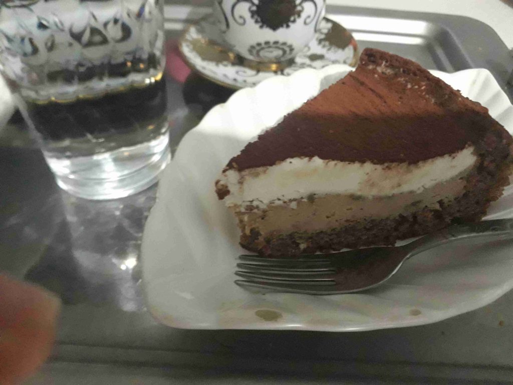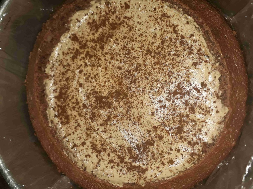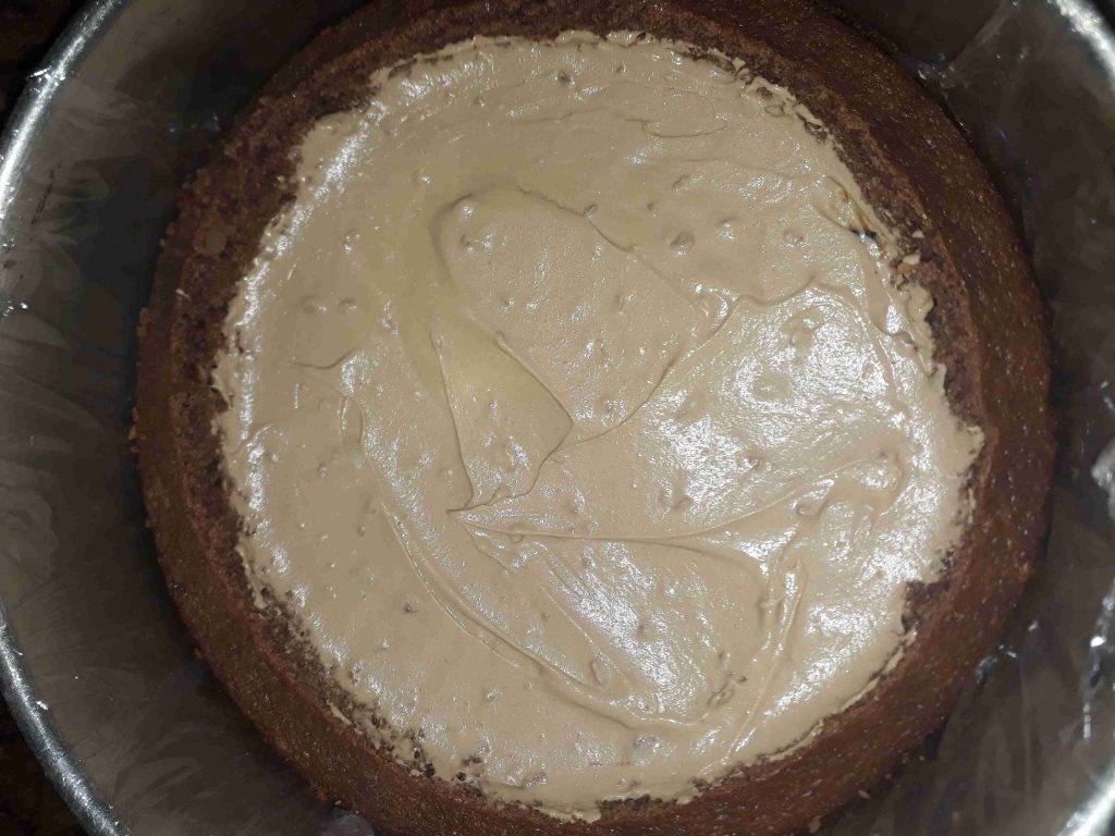 بعد مابردت الكيكة فرغت قلبا متل مو مبين بالصورة ورجعتا عالقالب وحطيت بوظة النسكافيه وساويت السطح دخلتا الفريزة نص ساعة وانا لاقوي نكهة النسكافيه رشيت شوي فوق البوظة