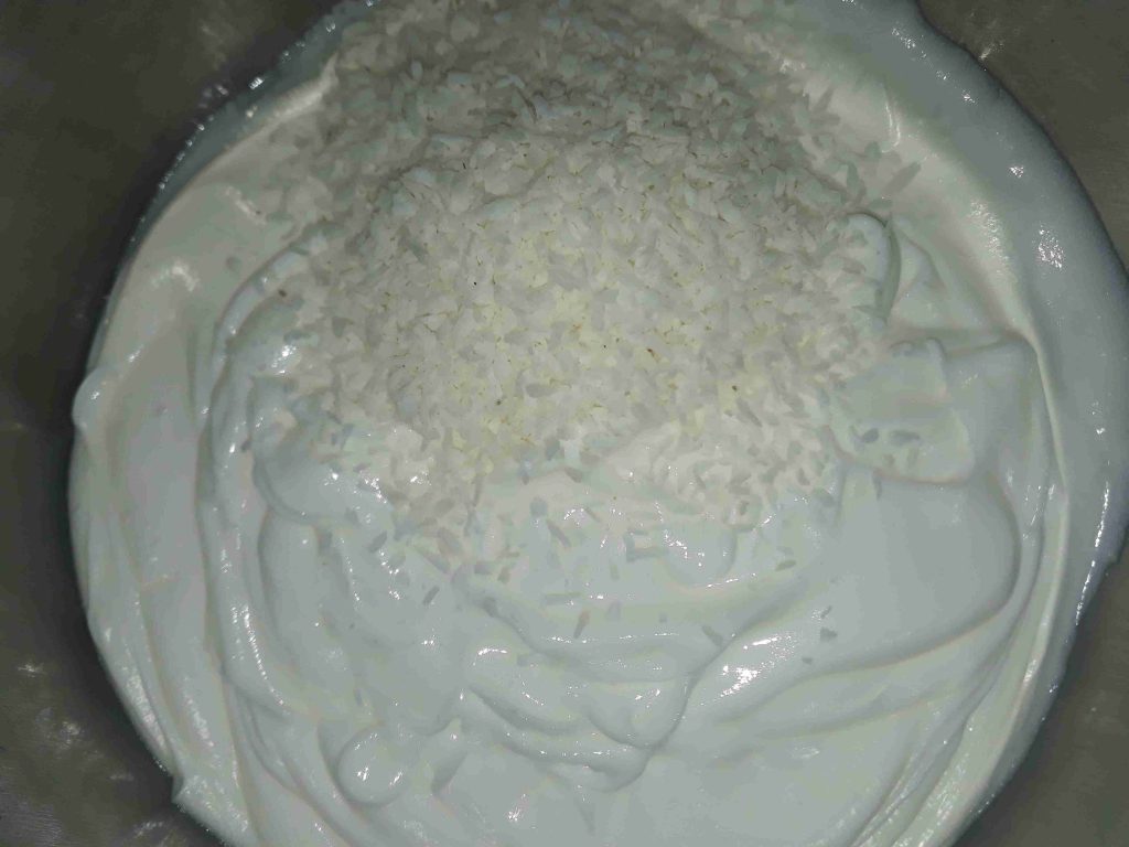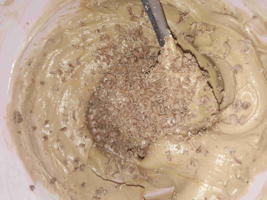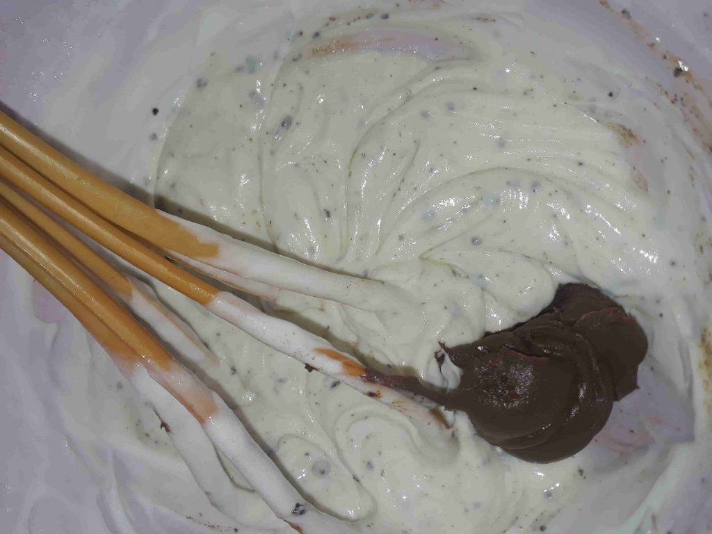 خلطت مكونات البوظة من عدا النسكافيه والشوكلا وجوز الهند قسمت الخليط لنصفين نصف حطيتلو نسكافيه وشوكلا دهن وشوكلا مبروشة