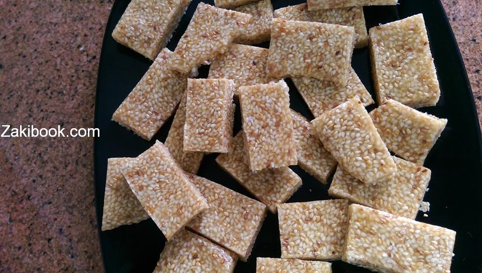 بعدها بتطفي النار عليهم وبحط السمسم وبقلب وبفردهم على قصدير لحتى يبرد شوي وبقطعهم
