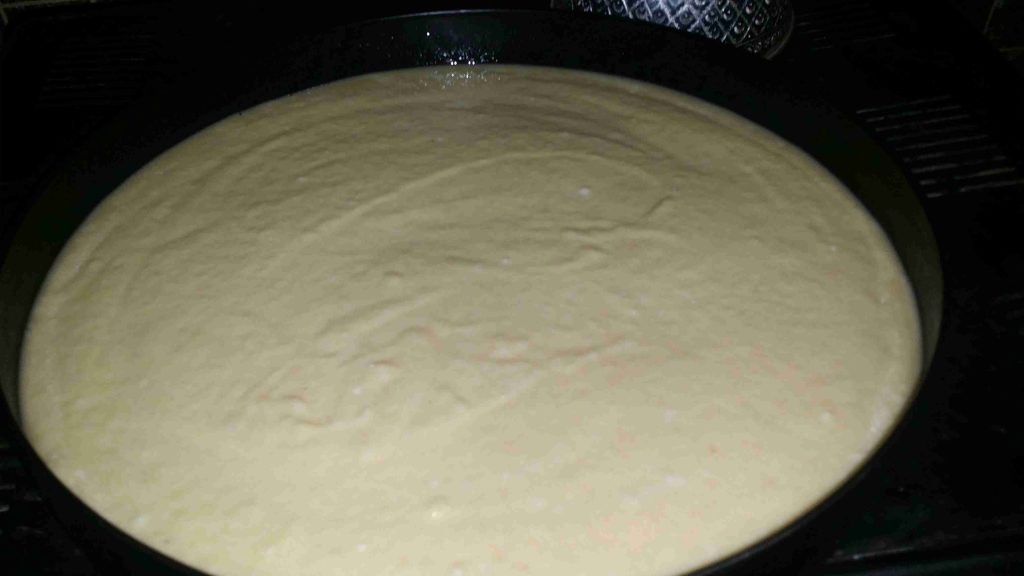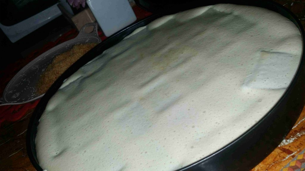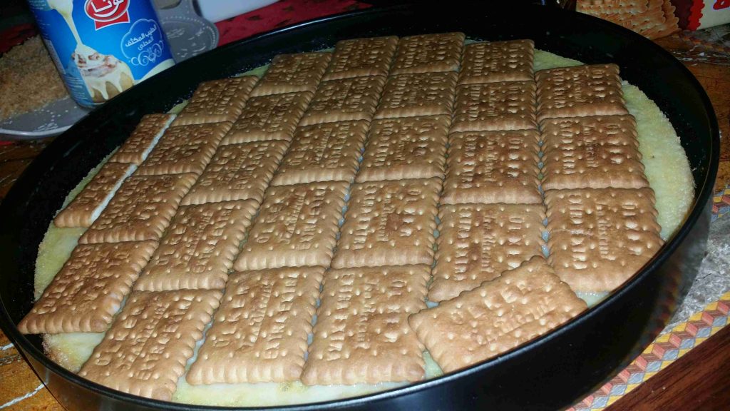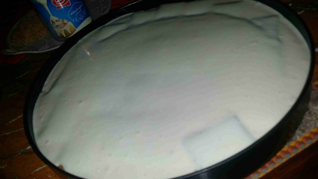 بـ اسكب الخليط اللي هو (علبة قشطة+علبة حليب محلى مكثف+ 4حبات جبن كيري)